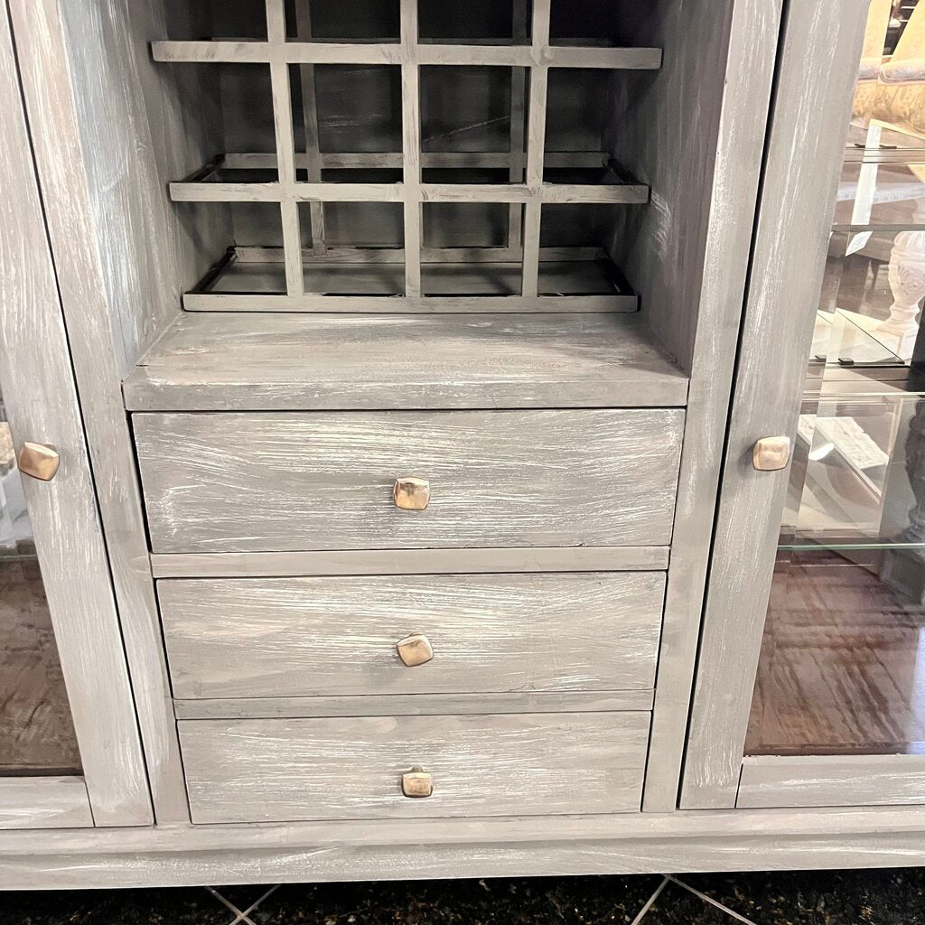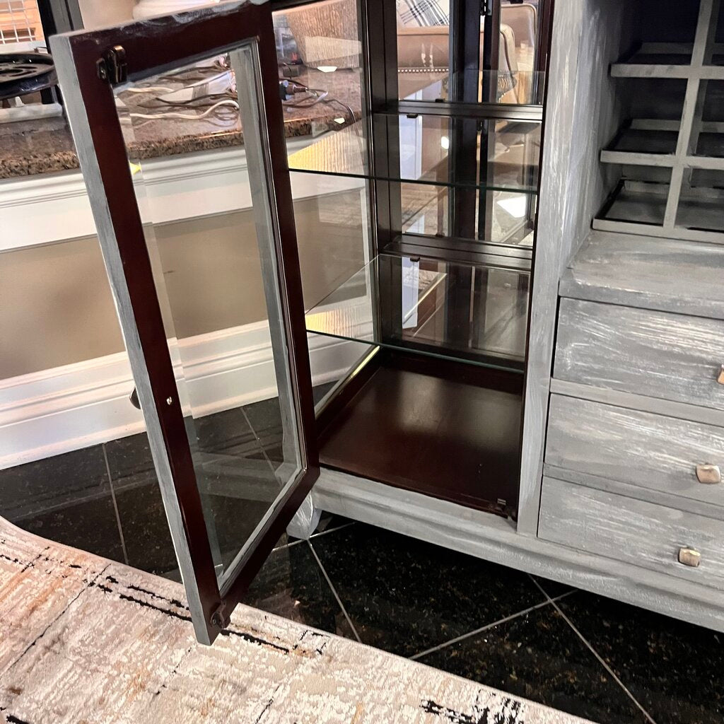 Condition Notes: Previously owned . This piece is a functional and stylish addition to your space, providing storage and a surface for display or serving. The black stone top offers a durable and elegant surface. There are 2 cabinets with glass front doors allowing for display, central drawers and shelving, and a wine rack. Overall great condition.