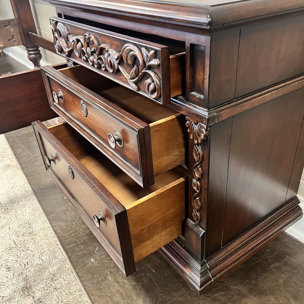 Condition Notes: Previously owned. This stunning piece featuresintricate carved details adorning the top drawer and side pilasters showcasing sophisticated aesthetic. This piece offers both exceptional style and practical storage with 3 spacious drawers each accented with classic hardware. Overall great condition.