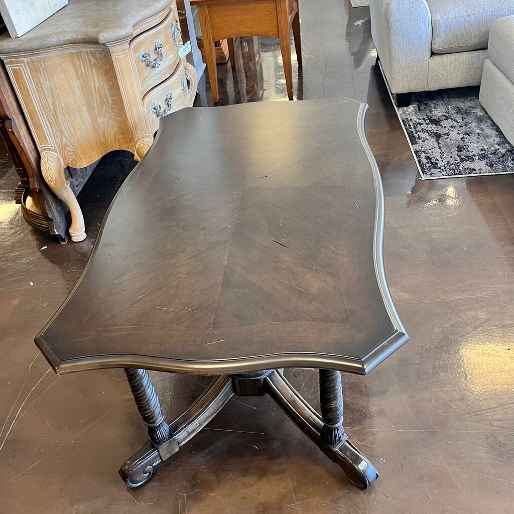 Condition notes: Previously owned. This elegant dark wood cocktail table, featuring a gracefully curved rectangular top, presents a sophisticated addition to any living space. Its distinctive design is highlighted by intricately turned fluted legs that rest on a sturdy, scrolled base offering both stability and charm. Overall good condition.