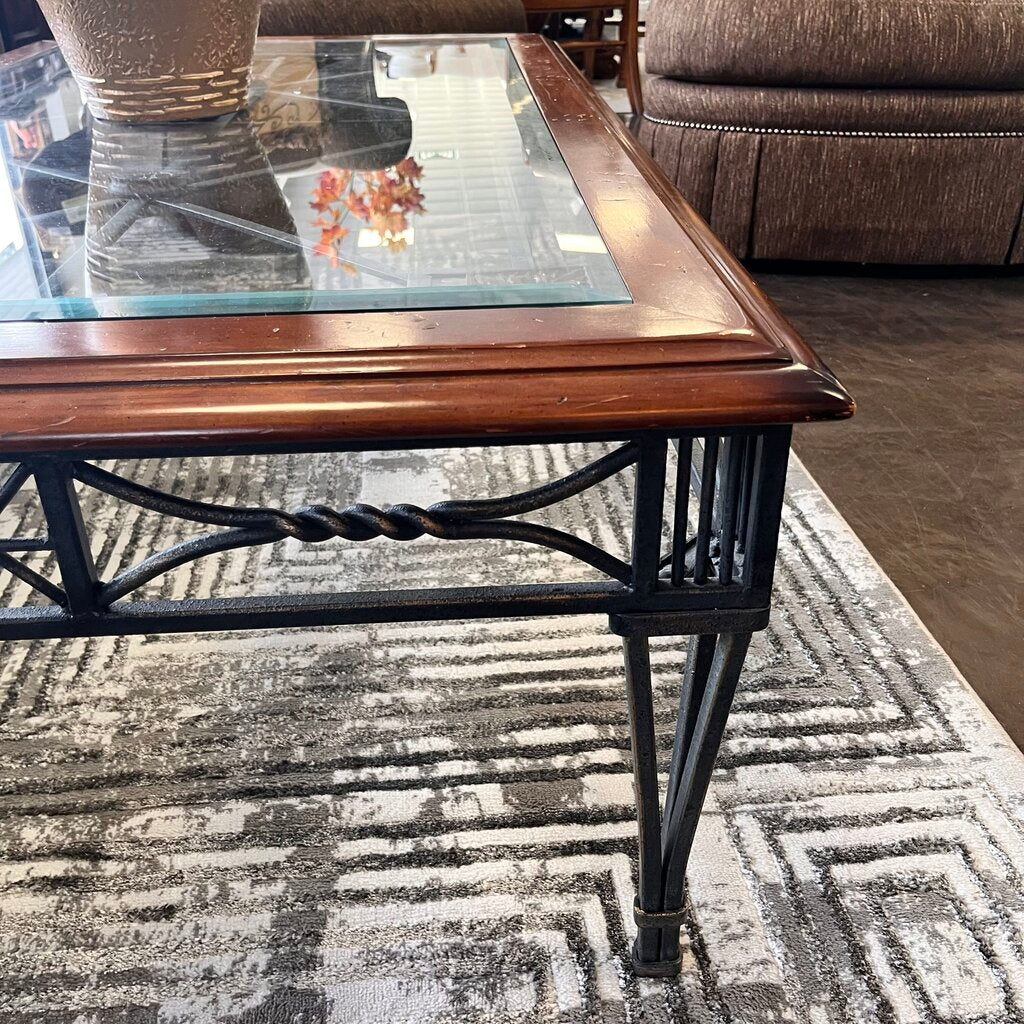 Condition Notes: Previously owned. This cocktail table features a decorative metal base with an x shaped stretcher and a beveled glass top surounded by a wood frame. A classic piece that will fit with most decor. Overall good condition.