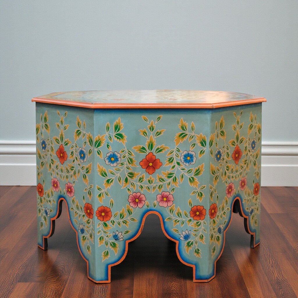 Brand New Item from Commercial Consignor \ floor pieces \ minor imperfections, scratches or wear otherwise BRAND NEW, Add a vibrant flourish to your space with the Butler Specialty Company Priya Hand Painted Coffee Table, where artistry meets function in bold, beautiful form. Inspired by traditional Indian floral motifs, its octagonal silhouette and vivid palette instantly energize any roomâ€'whether serving as a conversation-starting centerpiece in a living room or a statement piece in a boutique or gallery lounge. The intricate hand-painted design and scalloped base evoke old-world charm with a touch of bohemian elegance.