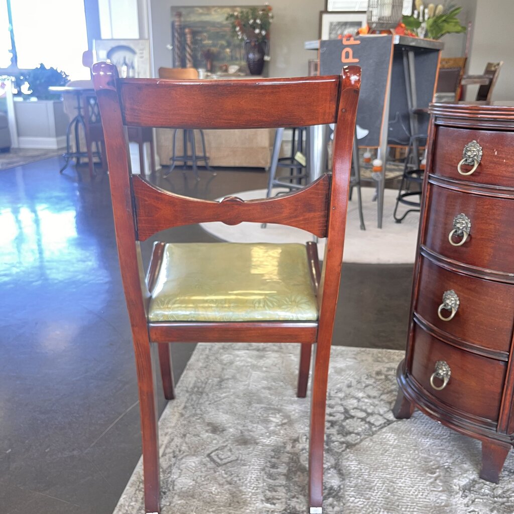 Condition Notes: Previously owned. This exquisite antique chair offerss a blend of classic elegance and timeless appeal perfect for enhancing any dining roo, study, or accent space. The gracefully curved back has a distinctive central medallion detail complemented be elegantly sculpted saber legs for a touch of Regency or Empire Revival style. The seat is upholstered and covered in vinyl for easy cleaning. Overall good condition.