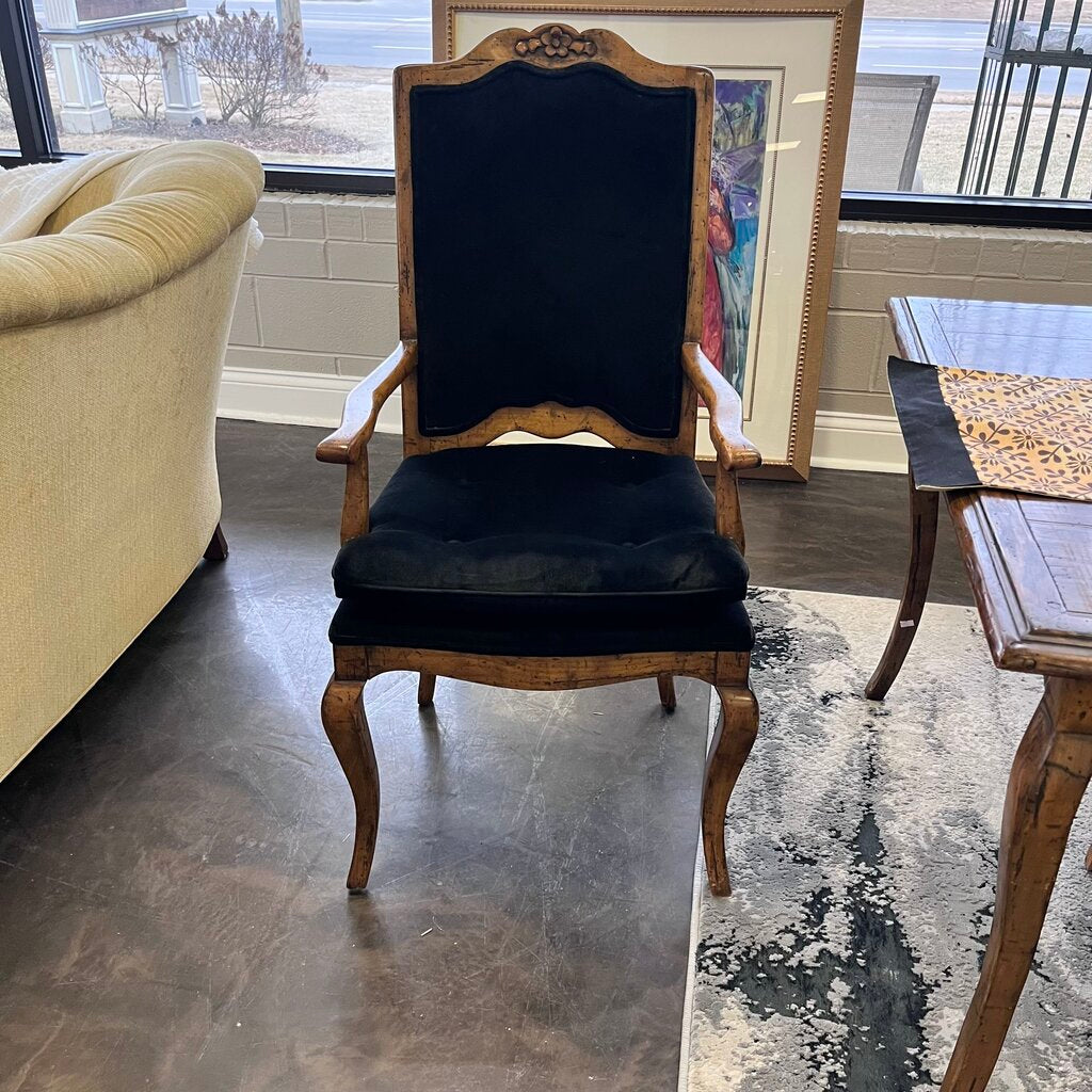 Condition Notes: Previously owned. Elevate your dining space with this beautiful dining table and chairs. The top of the table has a paneled appearance on a carved apron sitting on gracefully curved legs. The ladder back chairs boast, carving graceful curves, and a luxurious black velvet upholstery. All the comfort and stylish elegance to enhance your dining experience. Overall good condition.