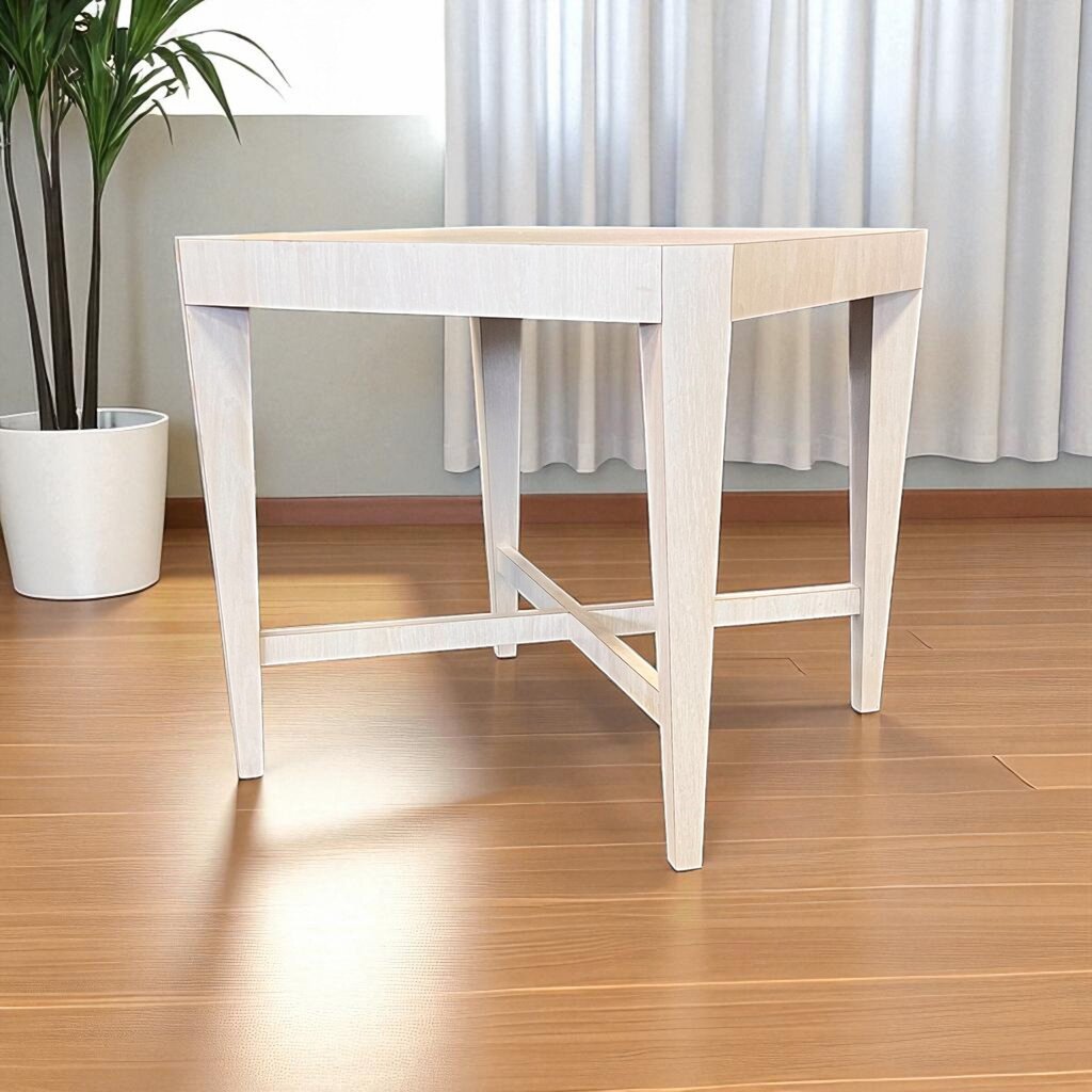 Condition notes: Previously owned. This modern laminated end table with a distinctive base presents a clean, contemporary aesthetic with straight lines and a minimalist look. The 4 sturdy legs are connected by an ex shaped stretcher that adds stability and visual interest. Overall good condition.