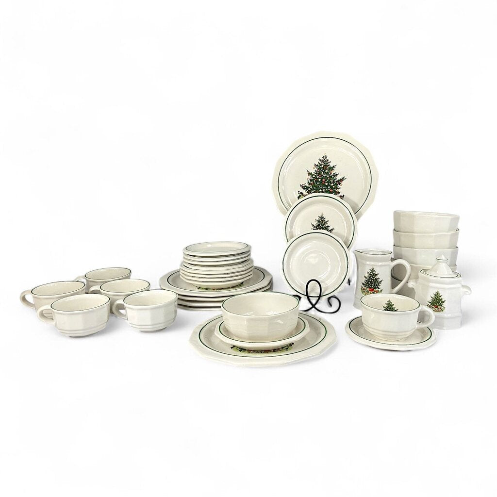 Condition Notes: Set includes 6 mugs, 6 saucers, 6 bread and butter plates, 6 dinner plates, 6 soup bowls, a creamer, and a sugar bowl. Good previously owned condition.