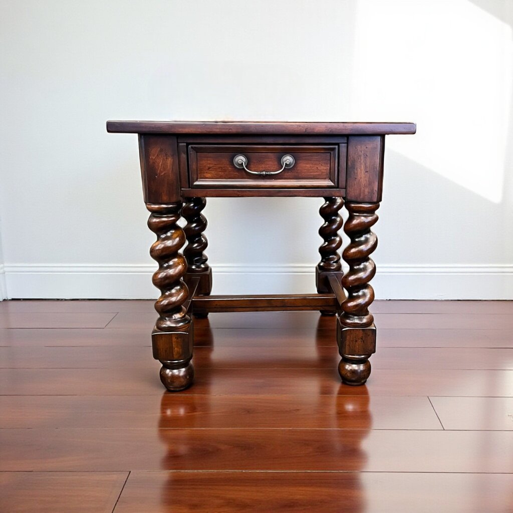 Condition Notes: Previously owned. This piece features striking barley twist legs that add a touch of classic sophistication to any room. Crafted with a rich warm finish this piece boasts a convenient drawer, perfect for storing essentials like remotes and reading glasses. Overall great condition.