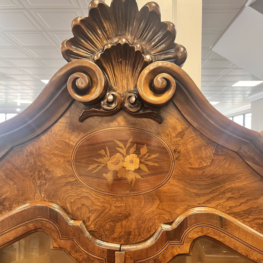 Condition Notes: Previously owned. This piece has a carved medallion at the top, burl wood, a glass case for books or collectibles, and 2 drawers for storage. This beautiful piece will make a true statement for your guests to enjoy. Overall good condition.