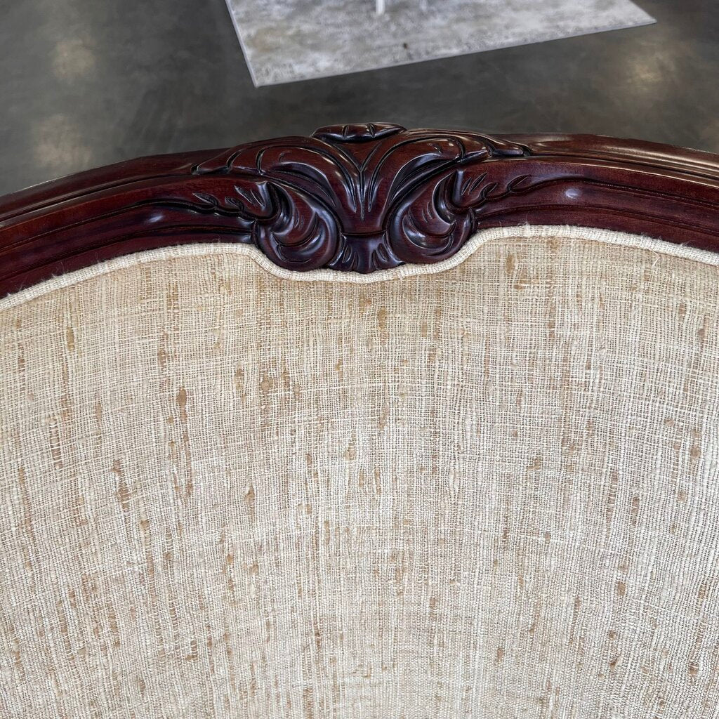 Condition Notes: Previously owned. Elevate your living space with this stunning French inspired armchair blending classic elegance with comfortable design. Featuring beautiful exposed carved wood frame, ekegant cabriole legs, gracefully curved arms, and a textured fabric. Overall great condition.