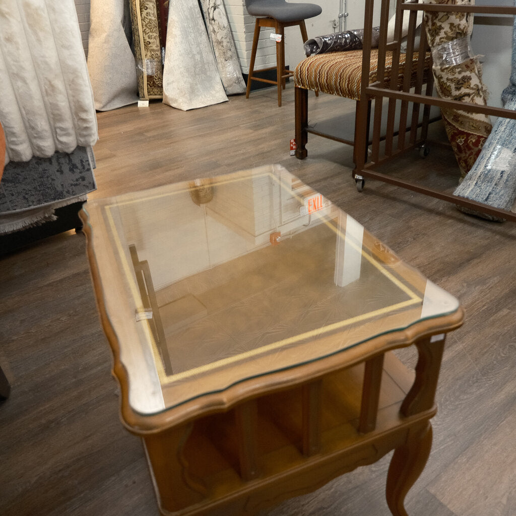 Condition Notes - wear consistant with age and use, features protective glass top, elegant cabriole legs scalloped edges with open-shelf design
