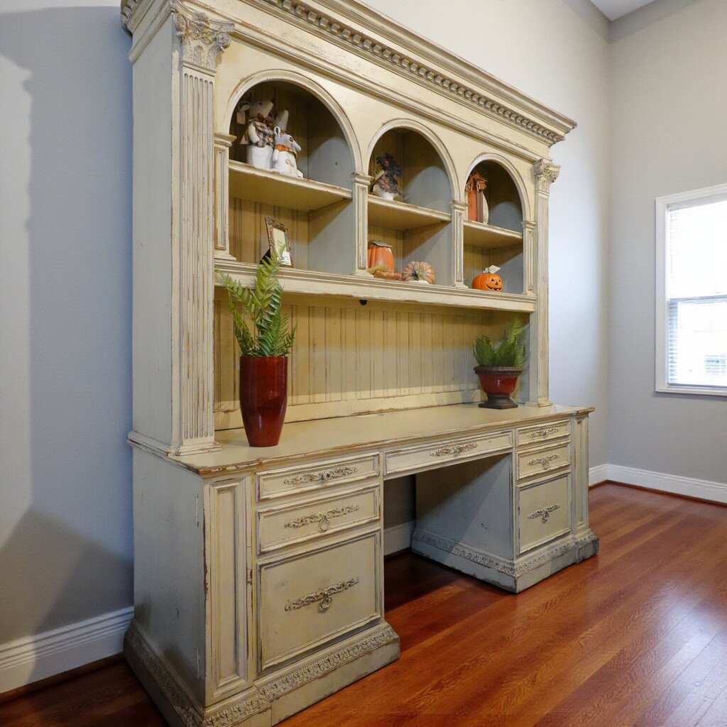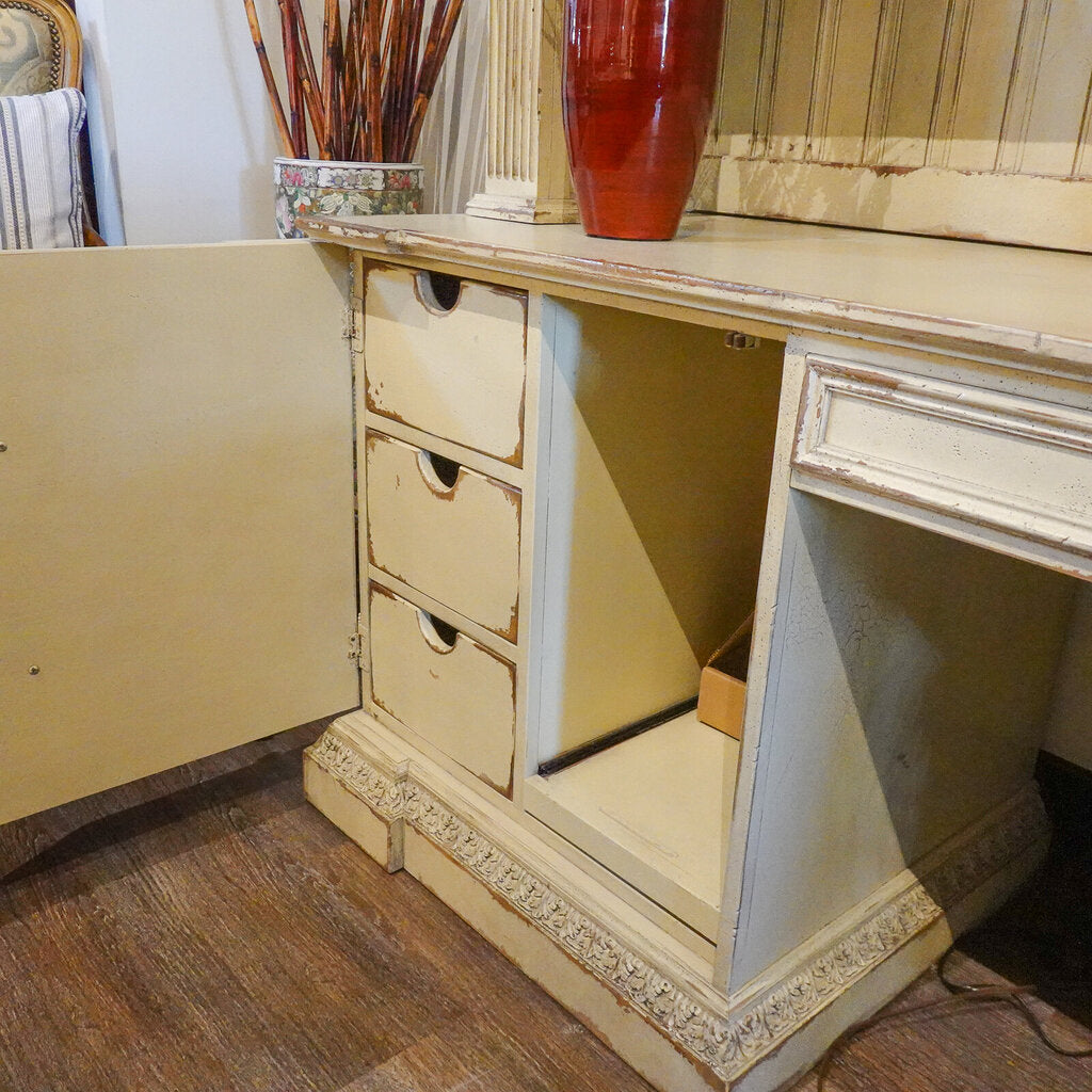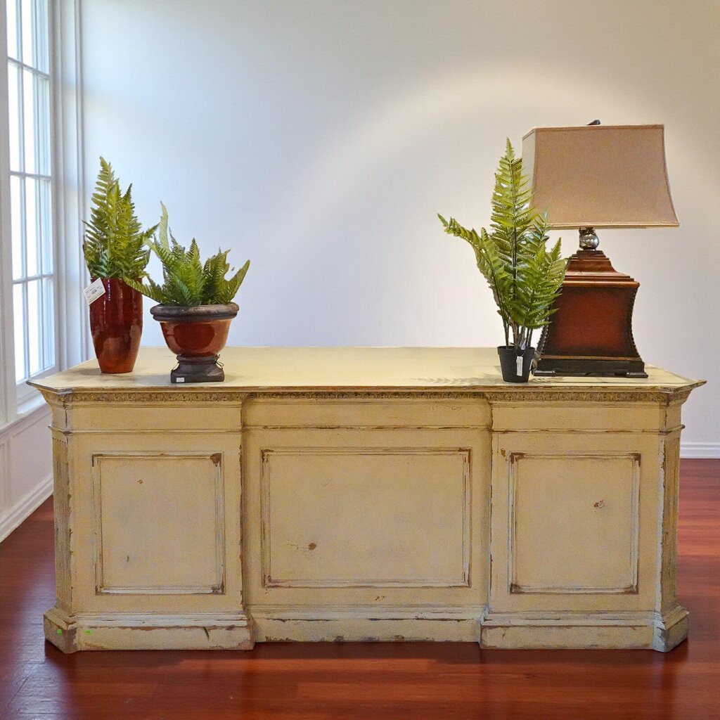 Condition Notes - chipping to surface coating on desk top, intentionally distressed finish, Set Includes - Executive Desk, Credenza with Hutch Top, Mastering both design and functionality, the Sussex Executive Office Suite, Clear-cut moulding lines the accented door panels,