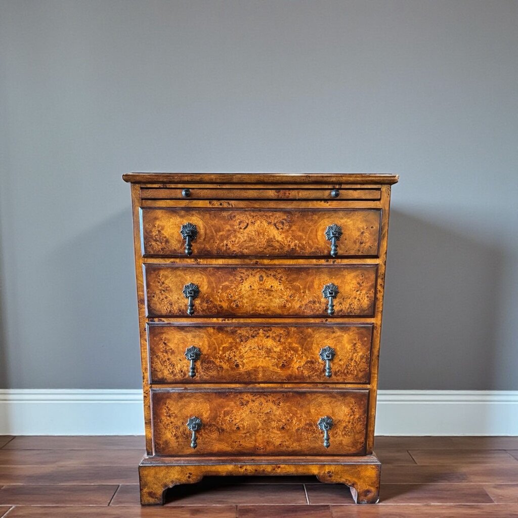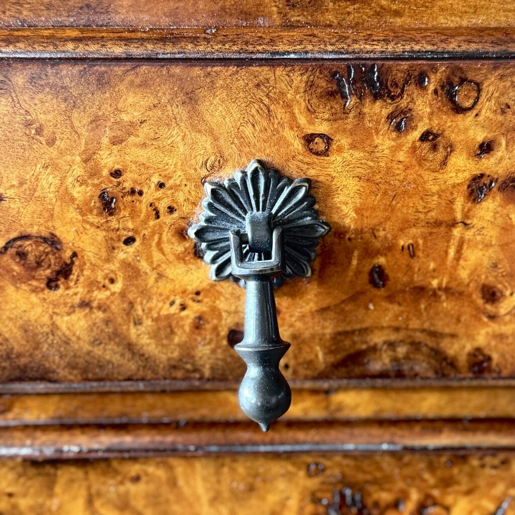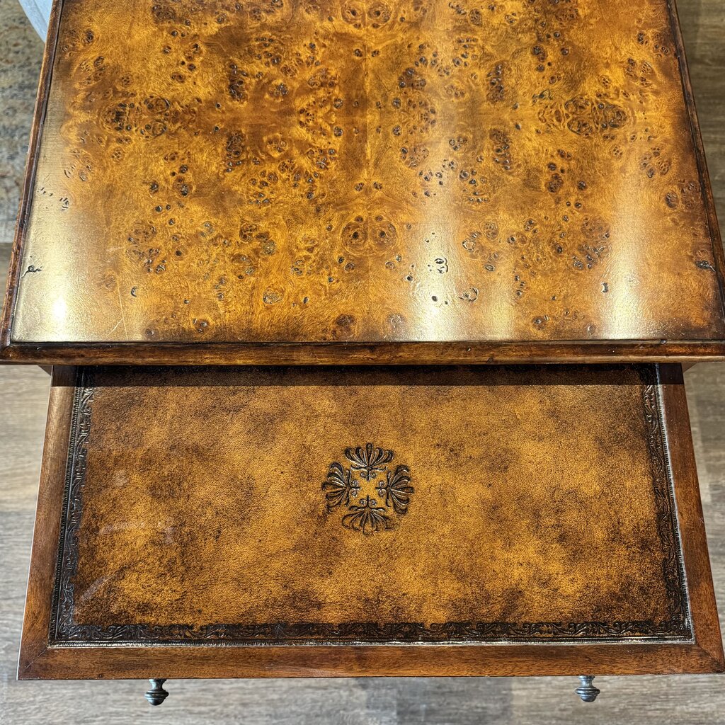 Condition Notes: A poplar burl bedside chest. Has a rectangular moulded edge top with a leather inset slide and four graduated drawers. The original George III. In excellent previously owned condition with corner damage to upper right top corner and bottom right corner .