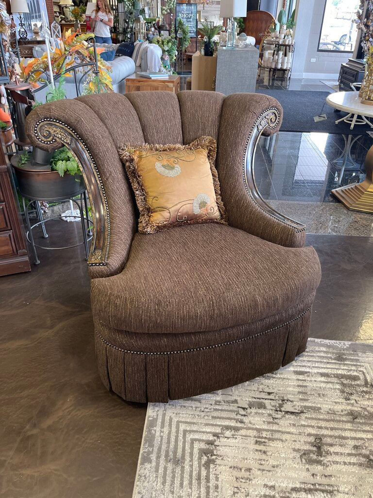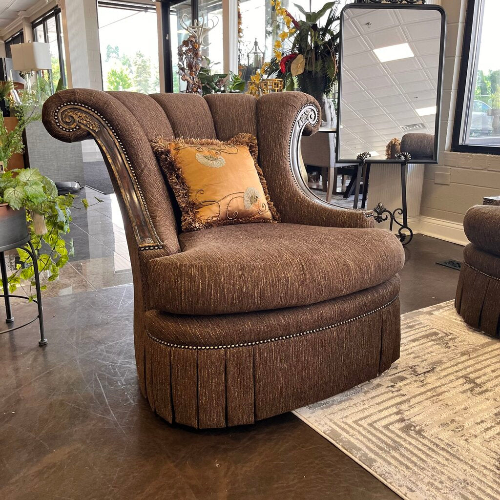 Condition Notes: Previously owned. This is a luxurious, Marge Carson-style chair that exudes elegance and opulence. The chair is a large, round swivel chair with an oversized, barrel-shaped seat that offers ample comfort and space. The high back is scalloped and flared, giving it a dramatic silhouette. It is upholstered in a rich, textured brown fabric with subtle golden undertones, enhancing its classic and upscale look. This chair captures Marge Carson's signature blend of traditional elegance, luxury materials, and artisanal craftsmanship.