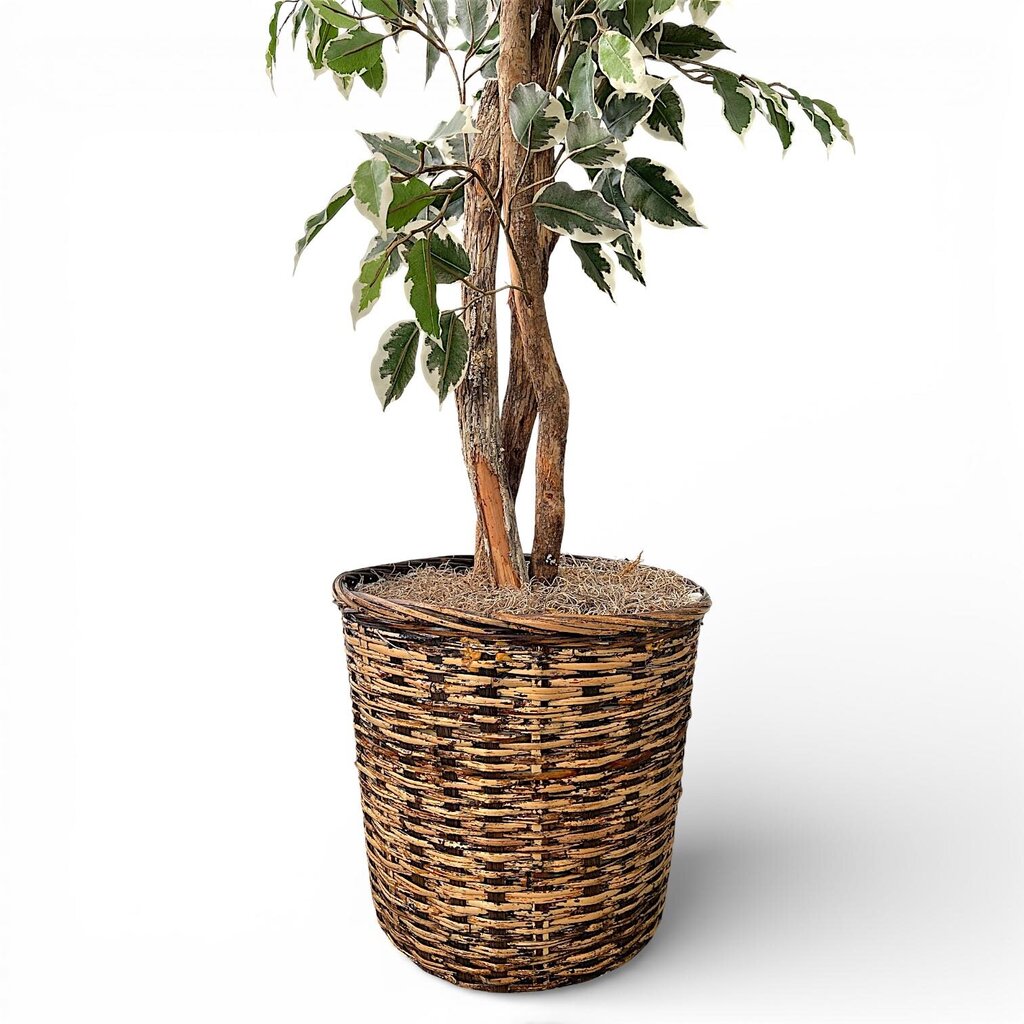 Condition Notes: This nearly 6.5-foot artificial variegated Weeping Fig, scientifically Ficus Benjamina Variegata, reliably brings a vibrant botanical presence to any interior. Its substantial height, combined with the classic woven basket planter, offers a sophisticated natural element for your home, completely free from the demands of watering or repotting. Excellent previously owned condition.