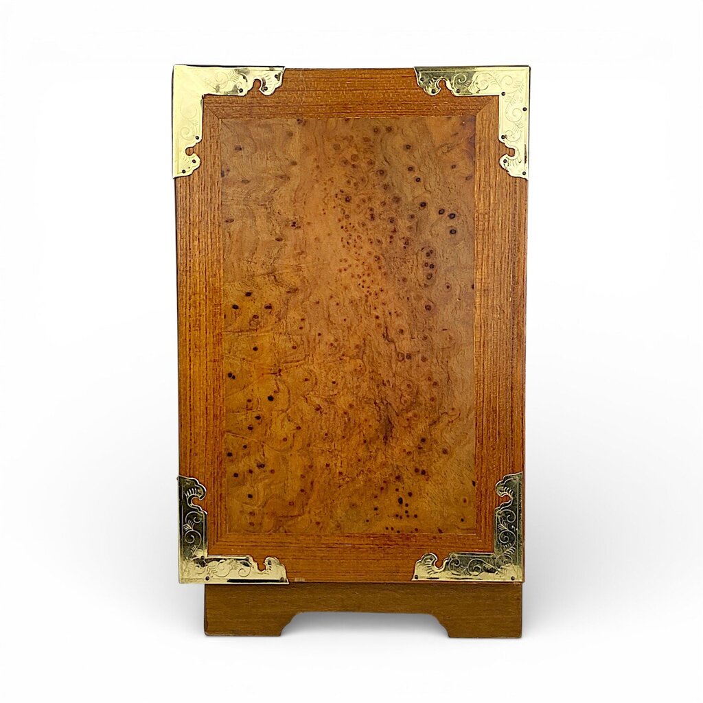 Condition Notes: This vintage jewelry chest is a testament to exceptional craftsmanship and enduring quality. Created in 1970s Korea, it showcases the beauty of burl wood and intricately etched brass hardware, radiating a timeless elegance. Its six drawers, lined with rich red velvet, provide ample space for your treasured keepsakes and jewelry. The smooth operation of the etched brass handles on each drawer, coupled with the secure brass rod lock, ensures your cherished valuables are stored safely and with confidence. Excellent pre-owned condition.