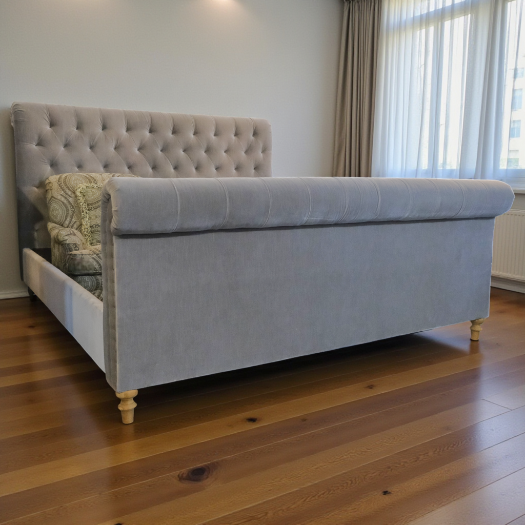 Condition Notes - Good Previously Owned Condition, contemporary fabric panel bed, inspired by clean-lined classical forms and is defined by simple silhouettes