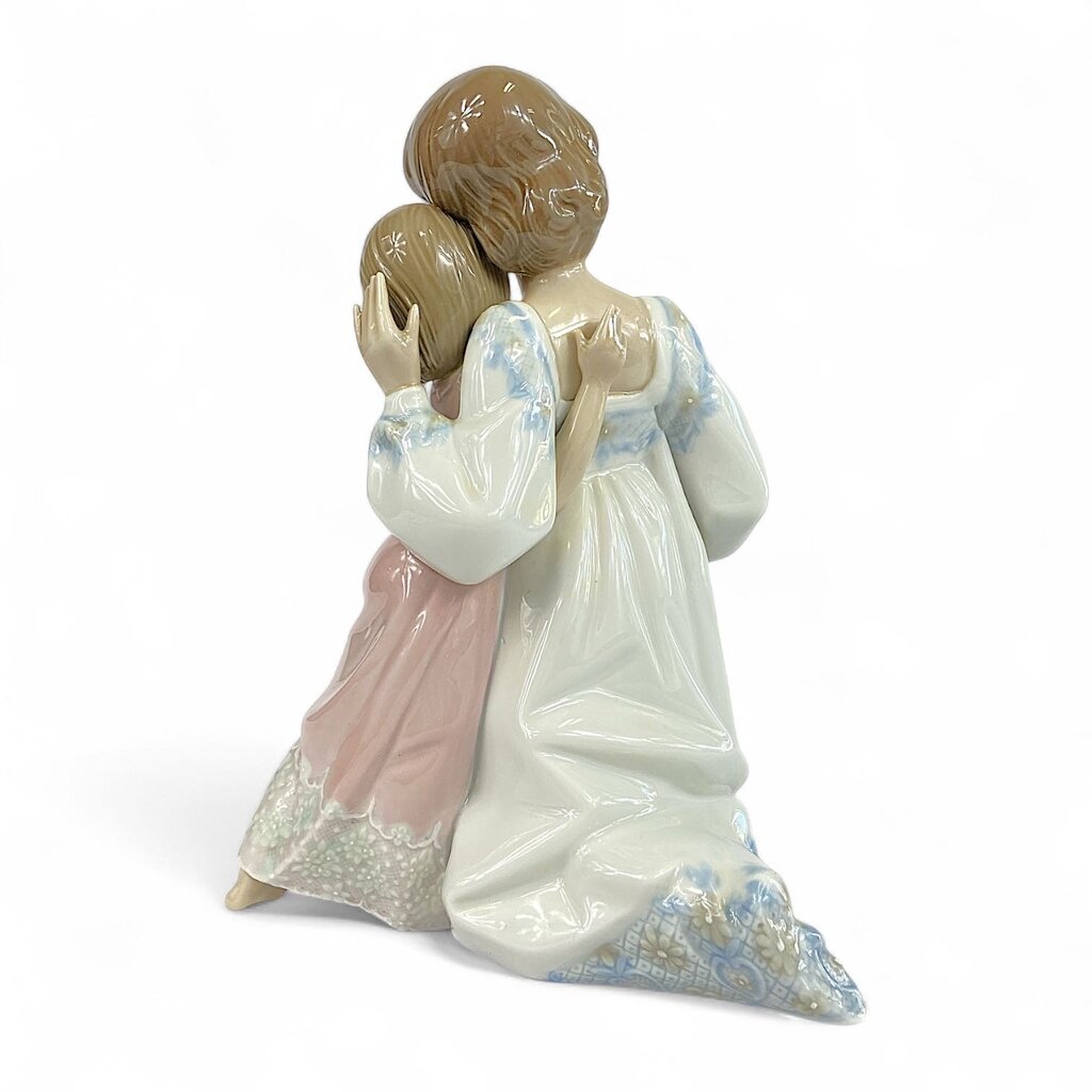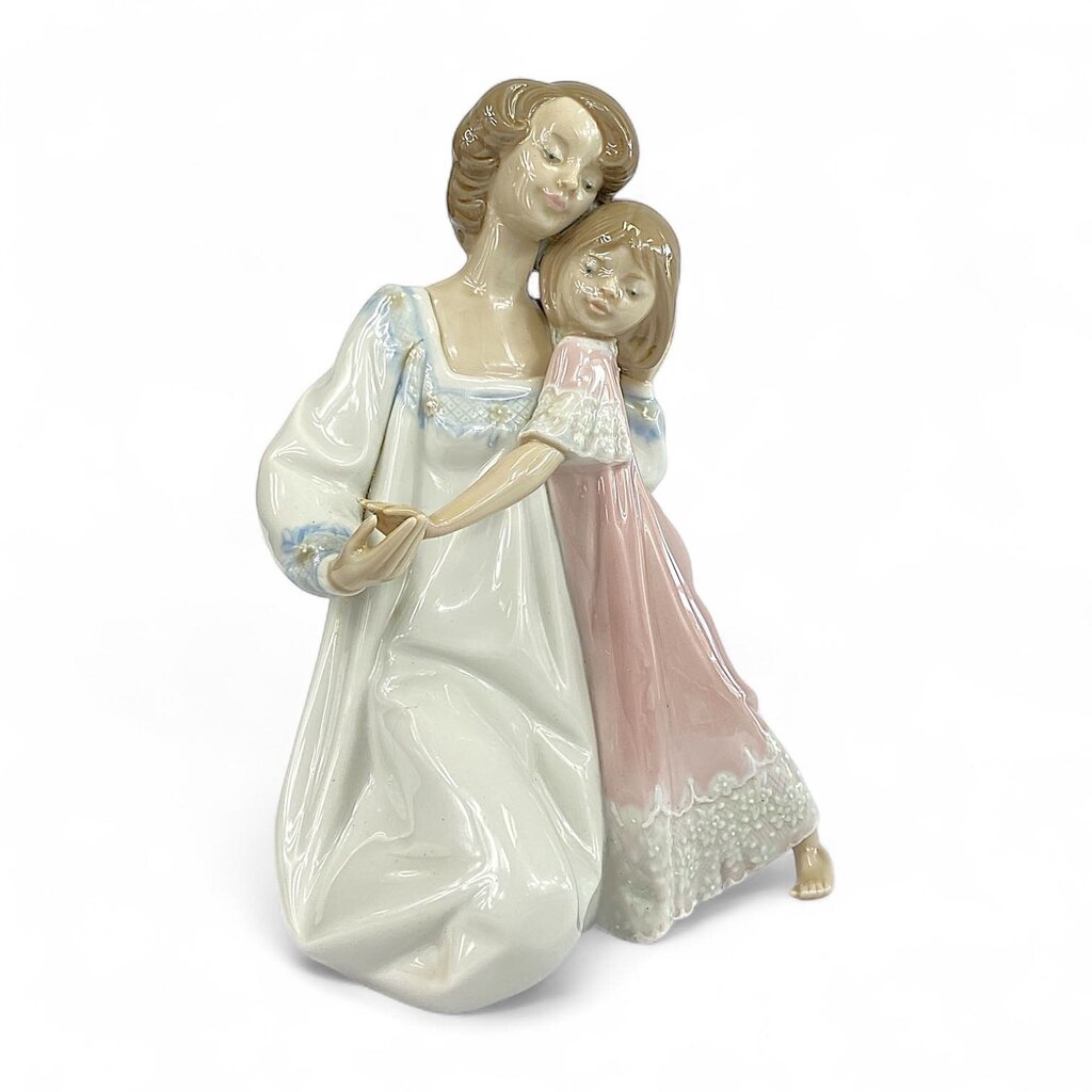Condition Notes: This collectible figurine depicts a mother and daughter hugging each other goodnight. Lladro figurines are highly sought after and are typically made of porcelain, often showcasing people engaged in various activities, such as flower picking, and presented in different contexts. Good previously owned condition.