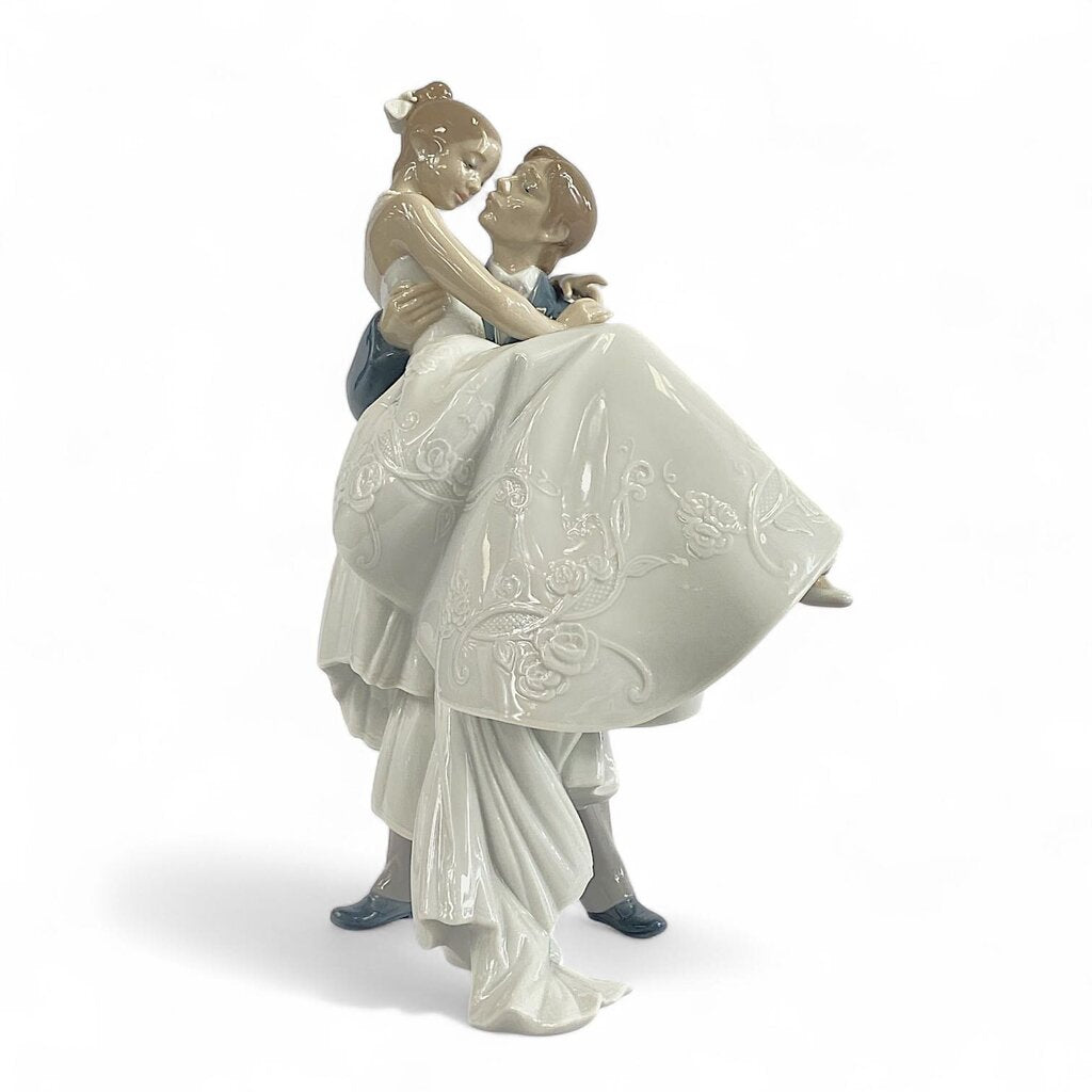 Condition Notes: This collectible figurine depicts a groom carrying his bride on their wedding day. Lladro figurines are highly sought after and are typically made of porcelain, often showcasing people engaged in various activities, such as flower picking, and presented in different contexts. Excellent previously owned condition.