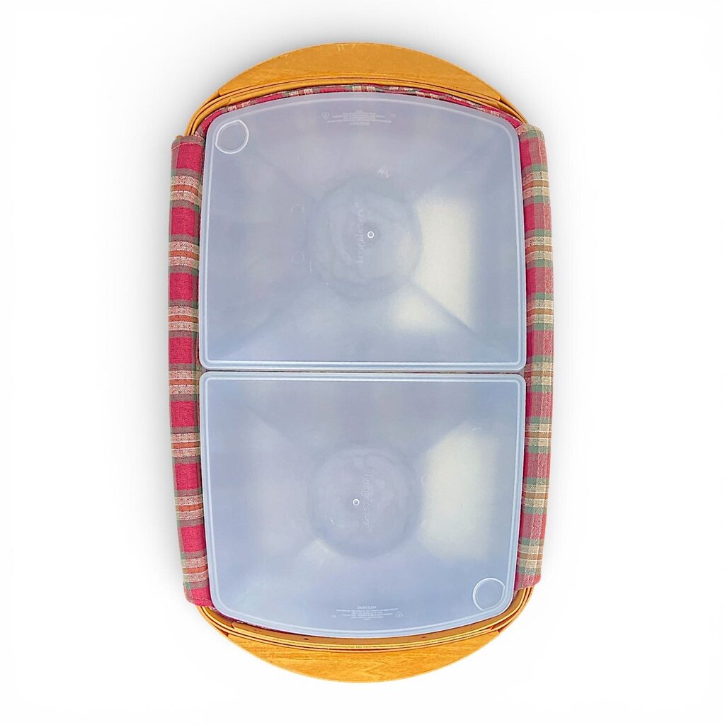 Condition Notes: This delightful handwoven maple and leather basket is from Longaberger's Serving Solutions line. It comes with a charming plaid liner, a practical plastic liner, and two lidded serving trays. A wonderful pre-owned find in excellent condition, and sure to bring joy to any Longaberger collector.