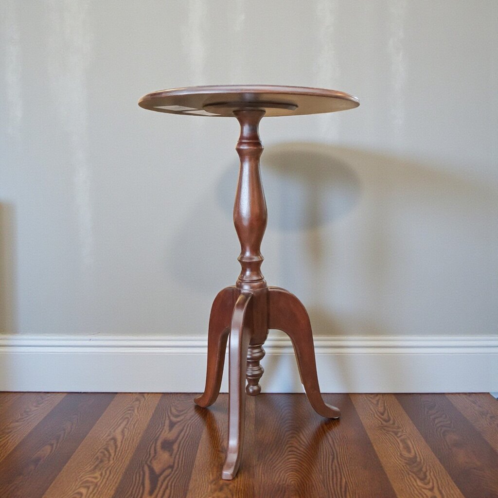 Condition Notes: Brand new overstock piece/floor sample piece. This side table boasts a traditional look with a medium brown finish. It sits elegantly on three pedestal feet with cabriole-style legs and a turned pedestal. Perfect for adding classic charm to any room. (Display piece/ back stock - will exhibit some imperfections, priced accordingly)