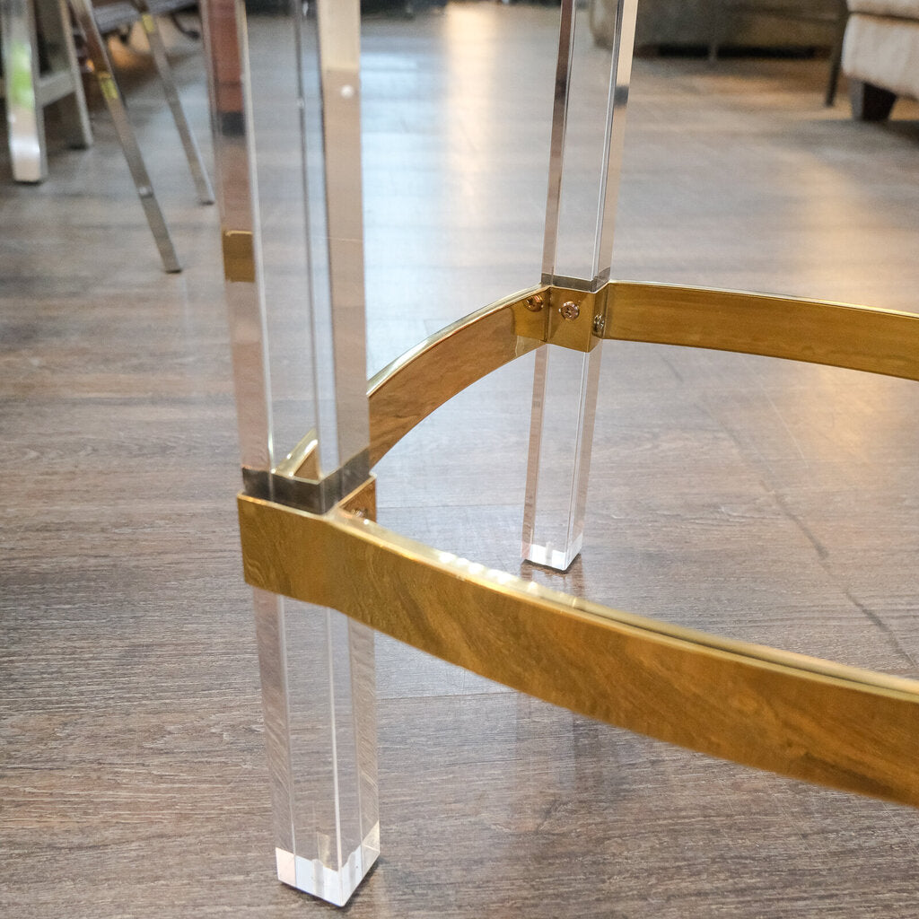 Brand New Item from Commercial Consignor \ floor pieces \ minor imperfections, scratches or wear otherwise BRAND NEW, Elevate your space with this Butler Specialty Company 24" seat height faux leather and acrylic counter stool, perfect for kitchens, breakfast bars, and commercial settings like cafés or lounges. Featuring sleek acrylic legs, a plush upholstered seat, and metallic trim with a footrest, it adds an airy, glamorous touch while complementing various aesthetics.