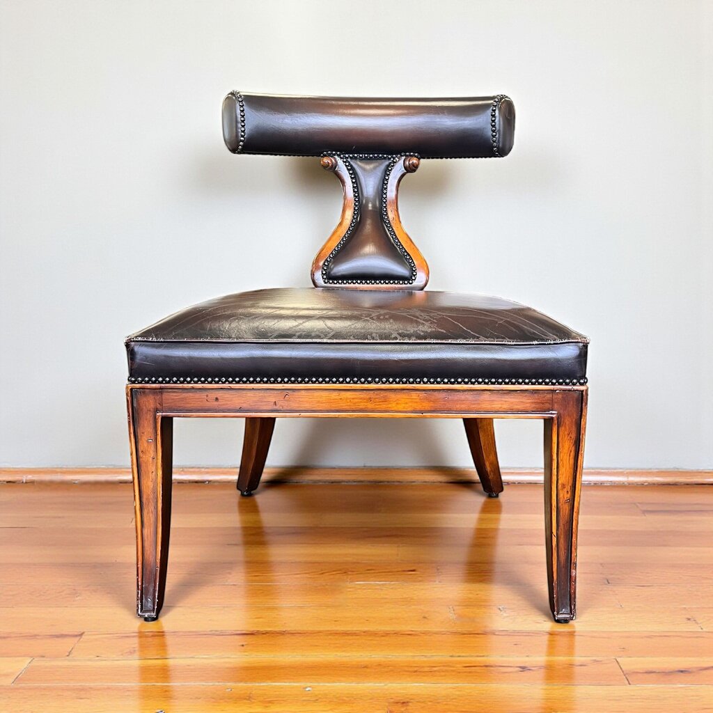 Condition Notes: Previously owned. This unique chair has a rolled back with leather cushioning and nailhead trim. Comfort and style is what you get with this chair. Leather seat has some cracking and wear. Overall fair condition.