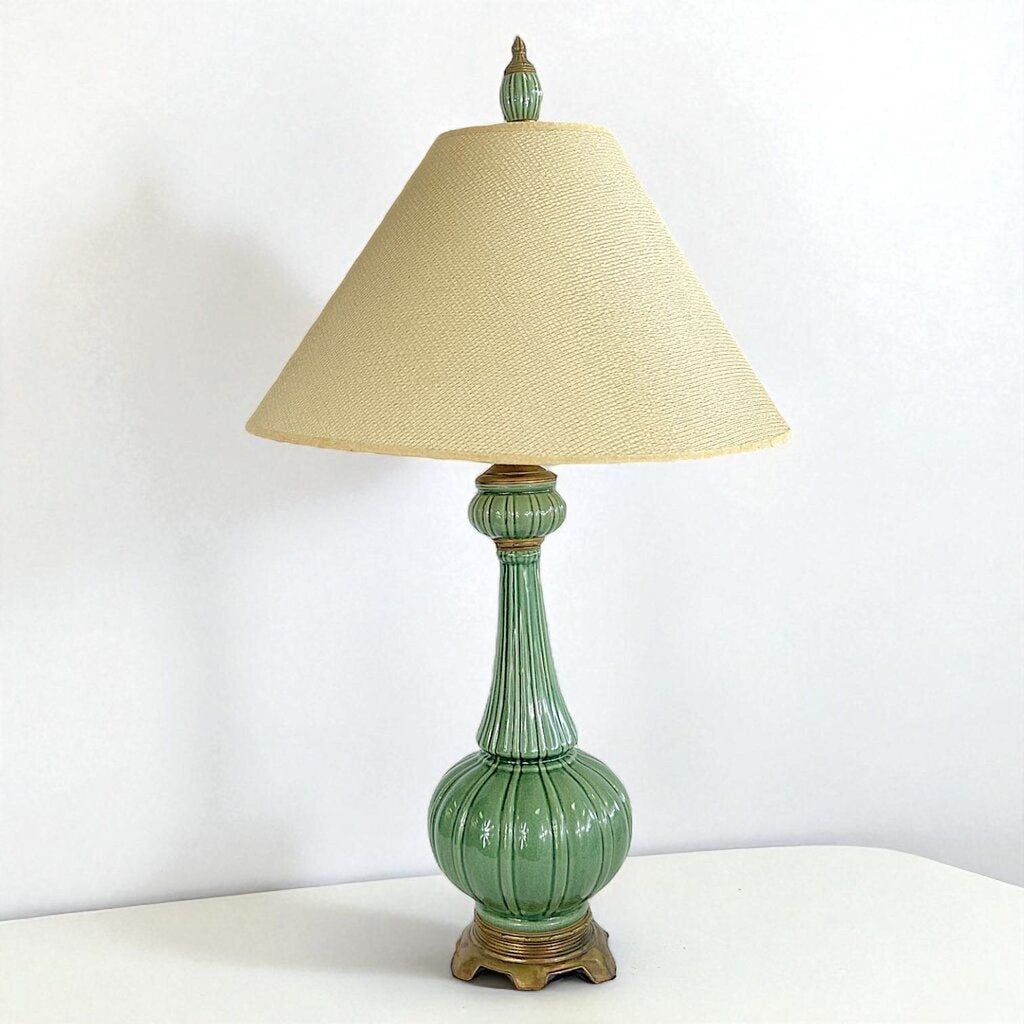 Condition Notes: The table lamp features a pale green ceramic body that matches the ceramic finial. With brass accents, this lamp is sure to add warmth to any room in your house. Excellent previously owned condition.