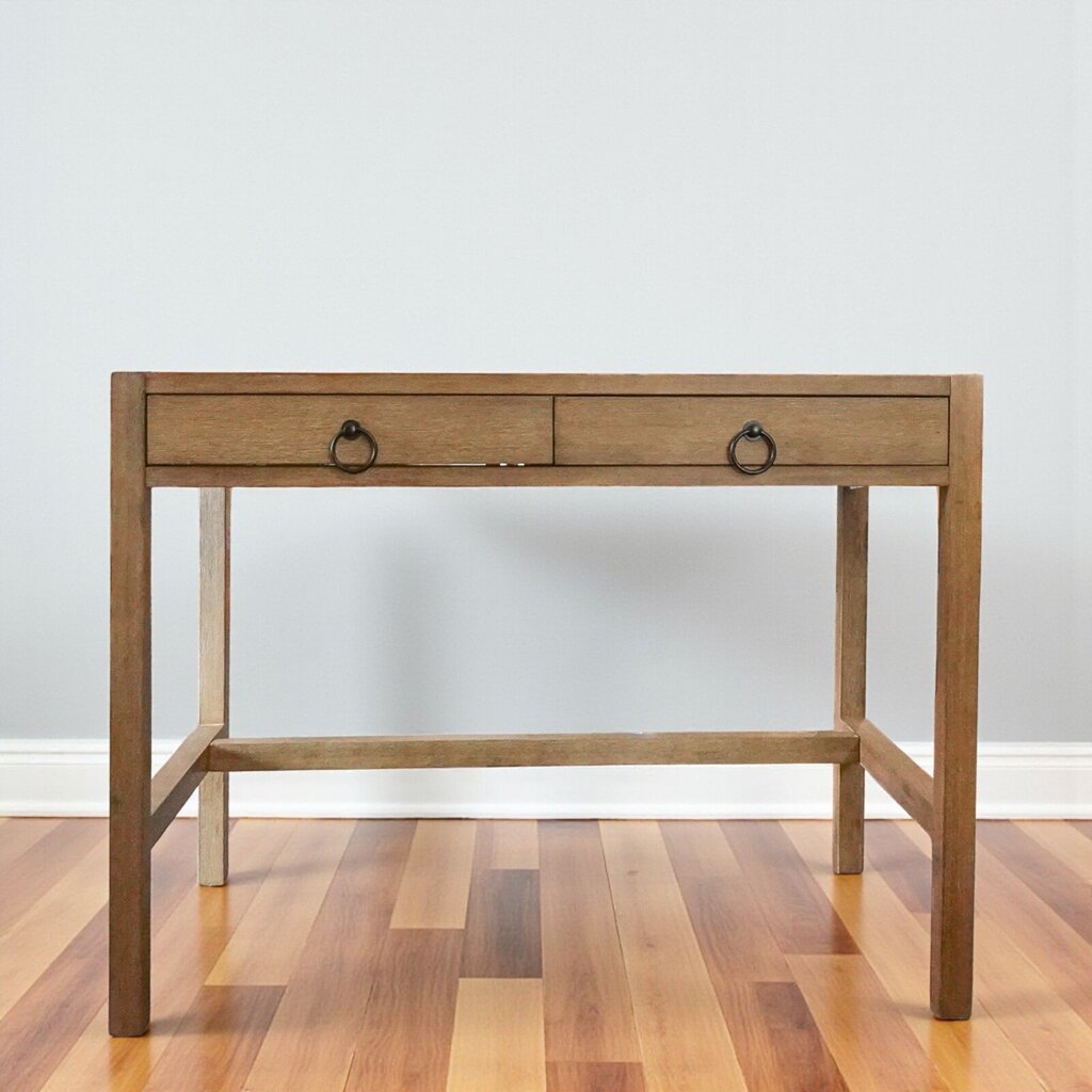 Brand New Item from Commercial Consignor \ floor pieces \ minor imperfections, scratches or wear otherwise BRAND NEW, The minimalist design of this stylish Butler Specialty Company desk makes it an ideal addition in any contemporary space. Crafted from acacia or pine wood solids and engineered wood products, it features two drawers with ring pulls, for a hint of glam, and ball bearing glides for easy opening and closing. Great for use in an office, living room or bedroom, and it is scaled for smaller spaces