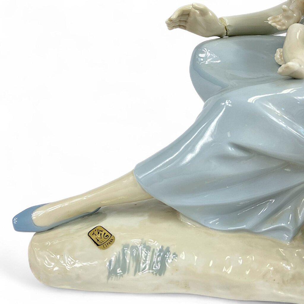 Condition Notes: This collectible is crafted from fine porcelain and is meticulously painted and glazed. It depicts a mother sitting with her child as they watch a duck. While the mother's hand has been reattached, the figurine is otherwise in good condition and has been previously owned.