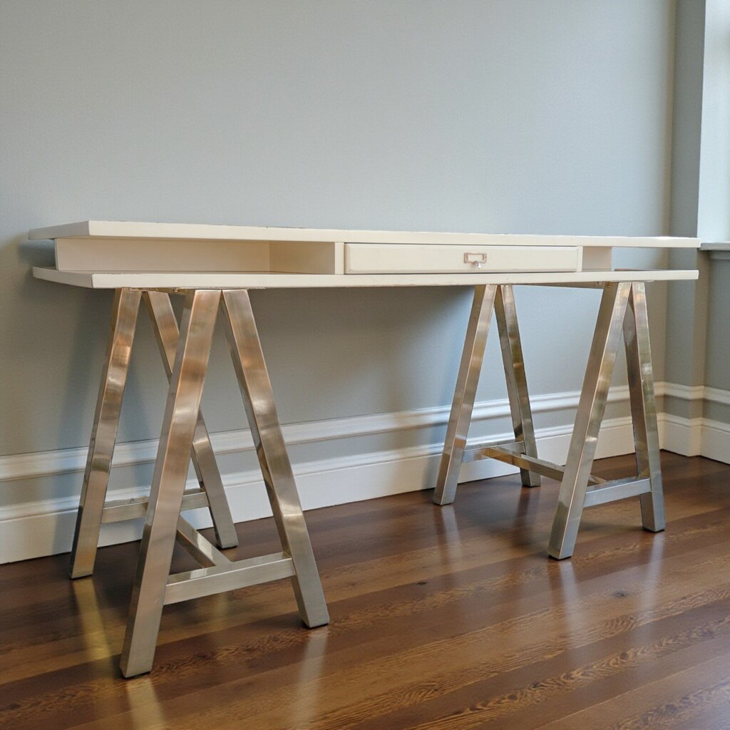 Condition Notes - Overall Good Previously Owned Condition, surface scuff marks and edge wear, features a modern look with white color top and a-frame style chrome legs