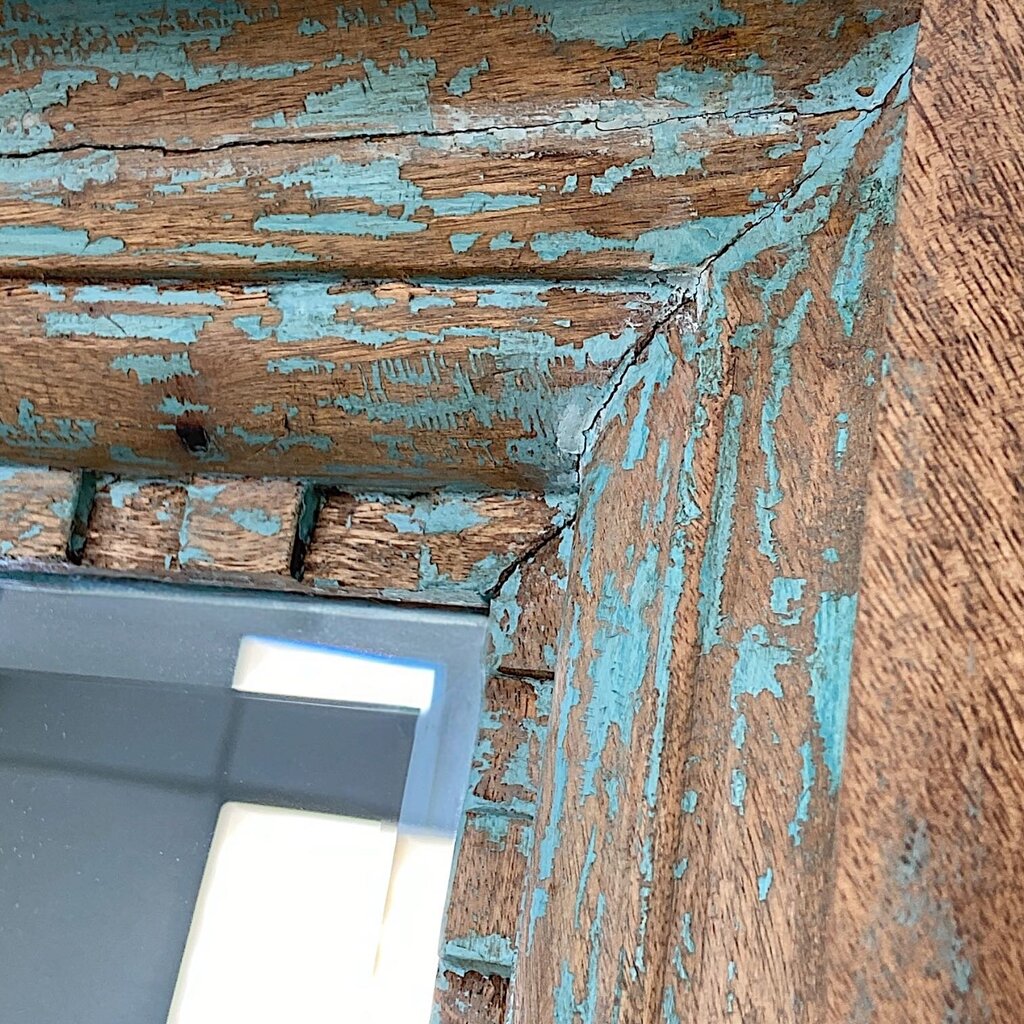 Condition Notes: This mirror is a Pottery Barn design, specifically the Aegean style. It features a wood frame with distressed teal paint. Please note that this is a heavy piece and requires mounting on a weight-bearing wall. Excellent previously owned condition.