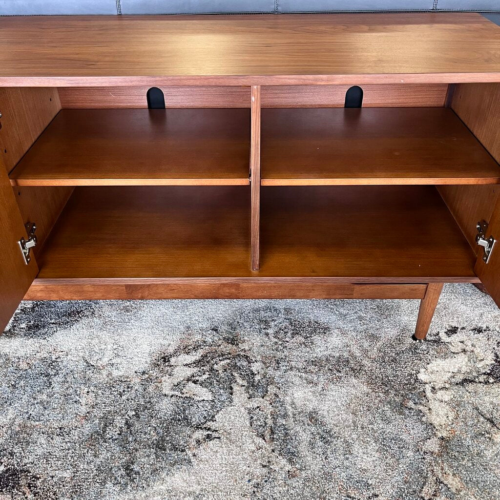 Brand new from a commercial consigner. The Olson console, available in light oak and walnut, features a versatile design with a multi-functional drawer. Perfect as a TV cabinet, accent piece, credenza, or server, it blends mid-century and Scandinavian styles for a timeless look.The Olson console features a versatile design with a multi-functional drawer. Perfect as a TV cabinet, accent piece, credenza, or server, it blends mid-century and Scandinavian styles for a timeless look.