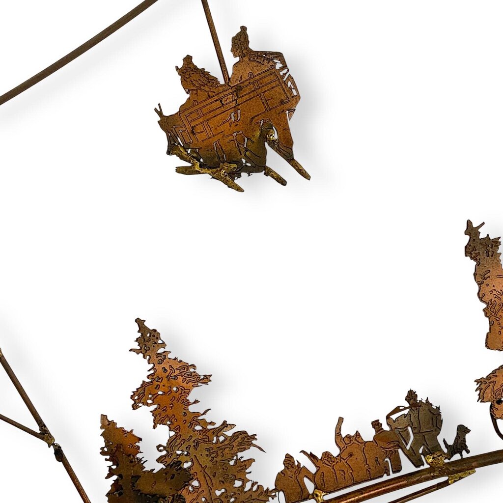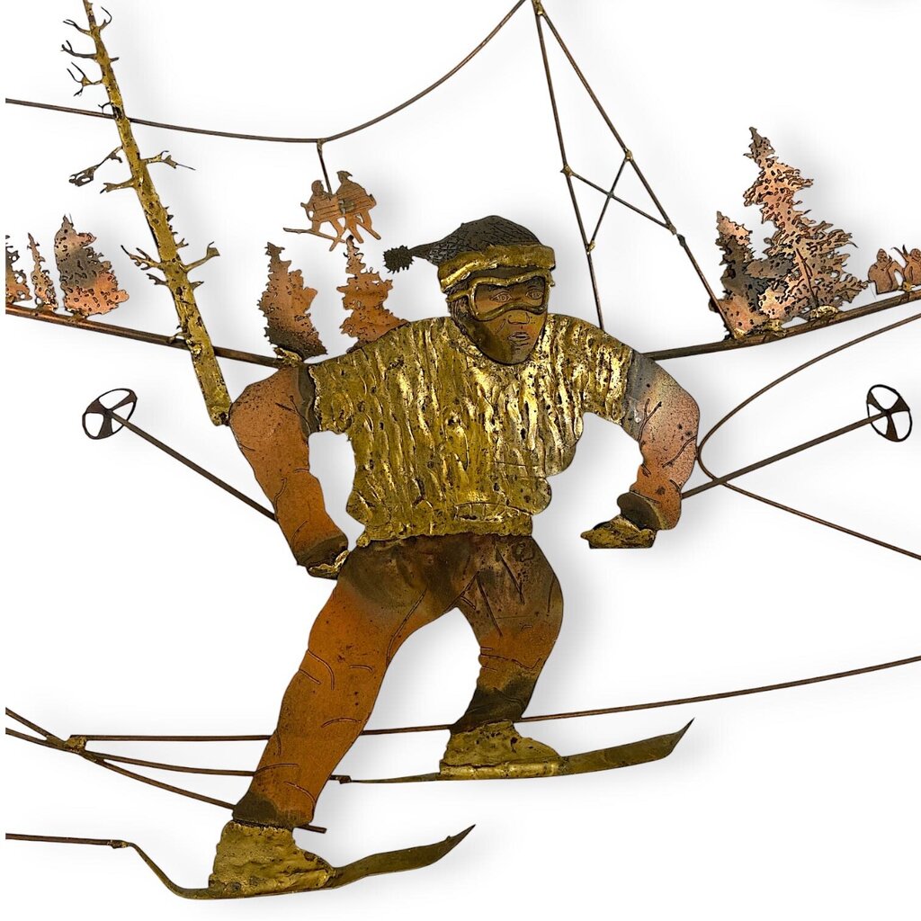 Condition Notes: This detailed wall hanging, crafted from copper and brass, portrays a ski resort landscape. The scene features a chairlift, several trees, and a skier. Its large size makes it a striking focal point on any wall in a home, especially for families who love winter sports. Good previously owned condition.