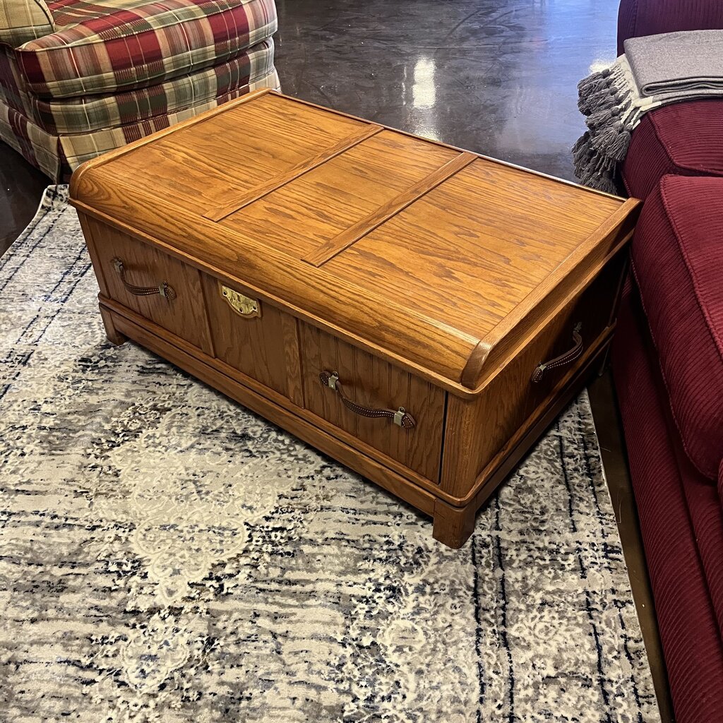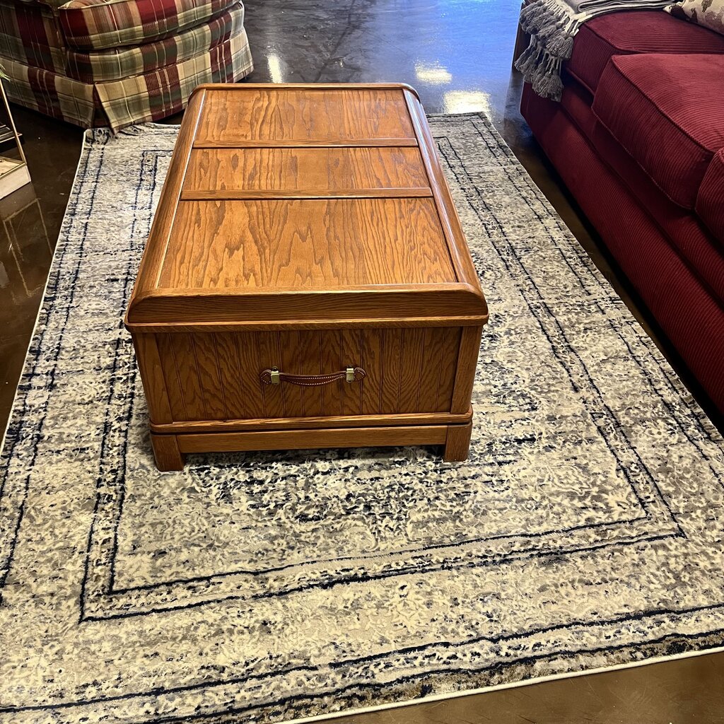 Condition Notes: Previously owned. This versatile and charming piece almost looks like a vintage trunk. The front and sides have leather handles, a brass "lock" and paneled front, and a drawer that that will give you ample storage. Overall great condition.