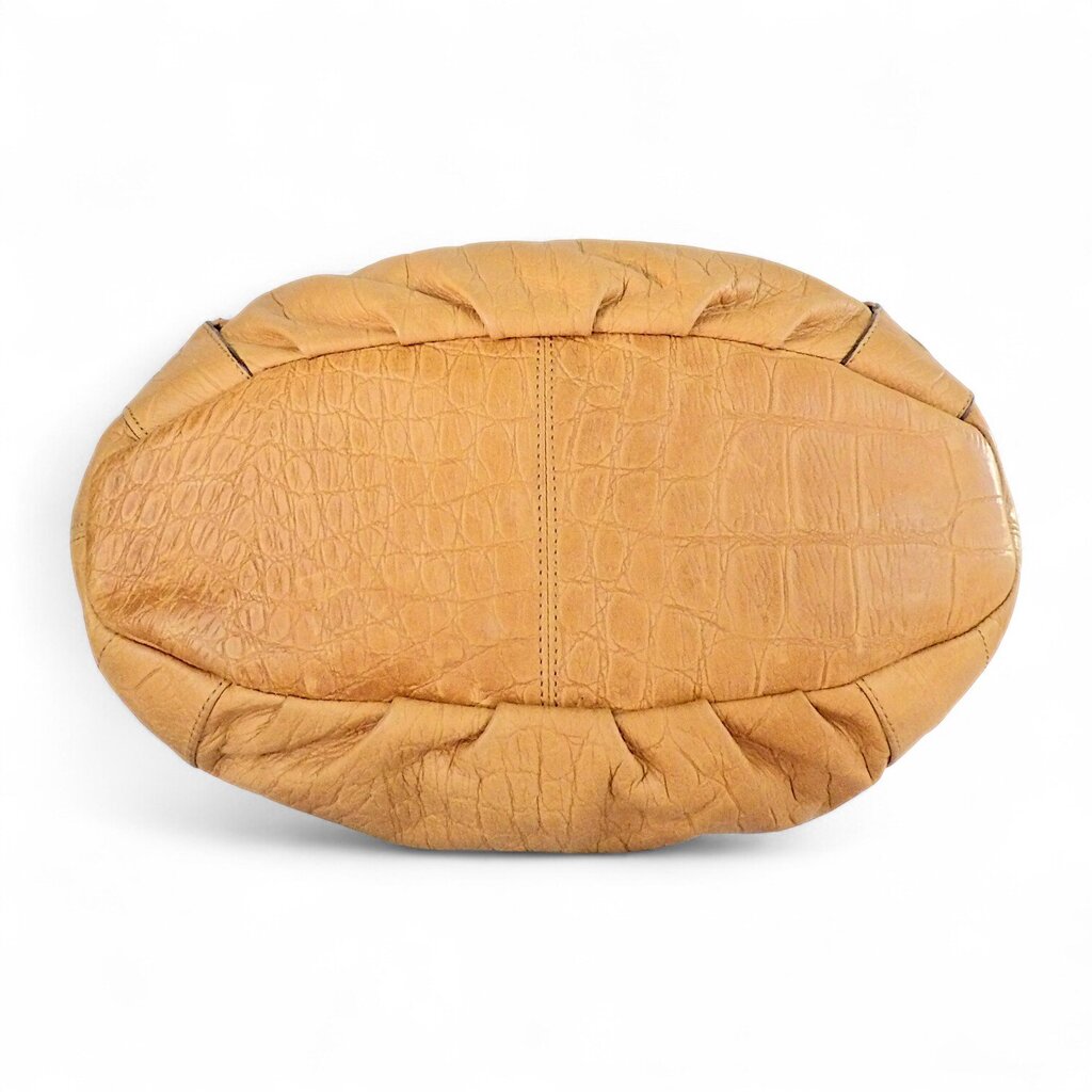 Condition Notes: This stylish, tan-colored handbag is made from a textured material resembling crocodile skin. It has a rounded, slouchy shape with a spacious body, giving it a soft and casual look. This handbag features 2 zipper pouches and a card holder on the exterior. Interior opens via a magnet clasp. Interior includes a large zipper pouch down the middle, a small side zipper pouch, and 2 open pouches also on the side. Interior fabric is leopard print polyester. Excellent previously owned condition.