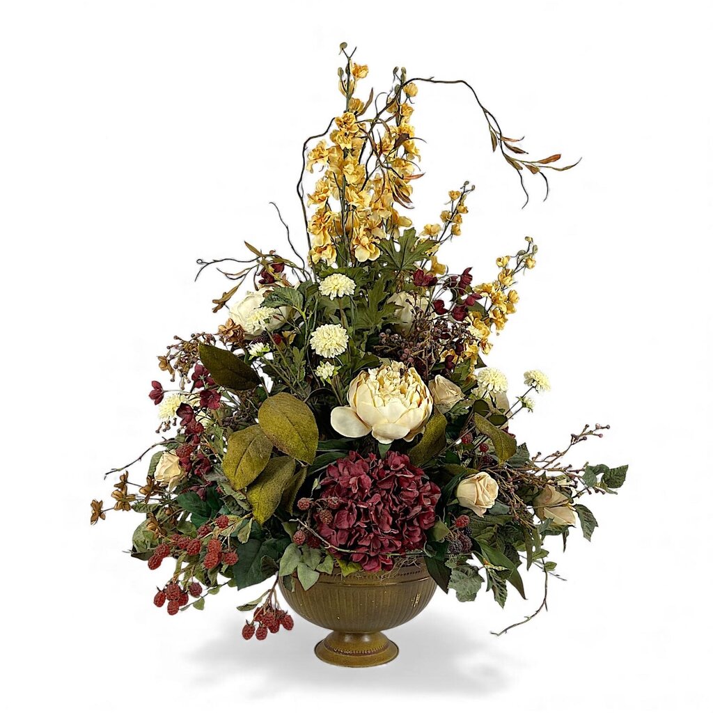 Condition Notes: This floral arrangement was custom-made and consists of various artificial plants. It includes raspberries, roses, hydrangeas, delphiniums, clematis flowers, and zinnias. The entire arrangement is housed in a footed metal bowl that is painted a dark mustard color. Excellent previously owned condition.