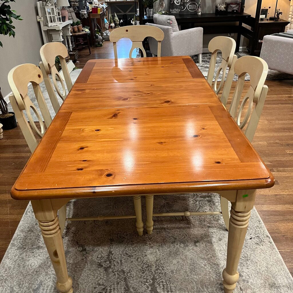 Condition Notes: Previously owned. This beautiful dining set will have the whole family gathered in comfort and style. Featuring 2 captain's chairs, 4 side chairs, a leaf and upholstered seats in a green and ivory fabric. Overall great condition.