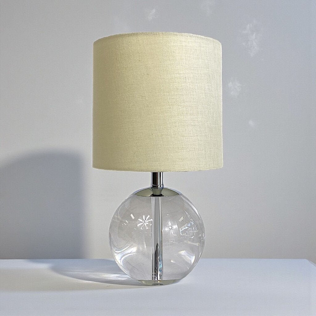 Condition Notes: This table lamp has a modern design suitable for desks or side tables. The lamp body features a clear orb construction and the shade is a drum-shaped design made of taupe canvas fabric. Excellent previously owned condition.
