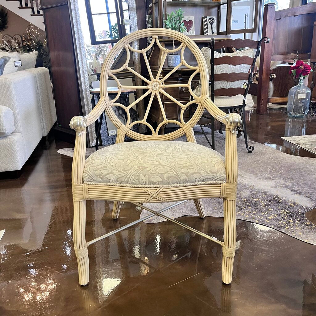Condition Notes: Previously owned. Elevate any dining space with this unique dining set. This set features a striking round glass table top that showcases the urn base. The lid comes off the urn. The rattan chairs boast a beautiful web design on the backs and the upholstered seats are covered in a sophisticated neutral fabric. This piece is perfect for a sun room, dining room, or covered patio. Overall excellent condition.