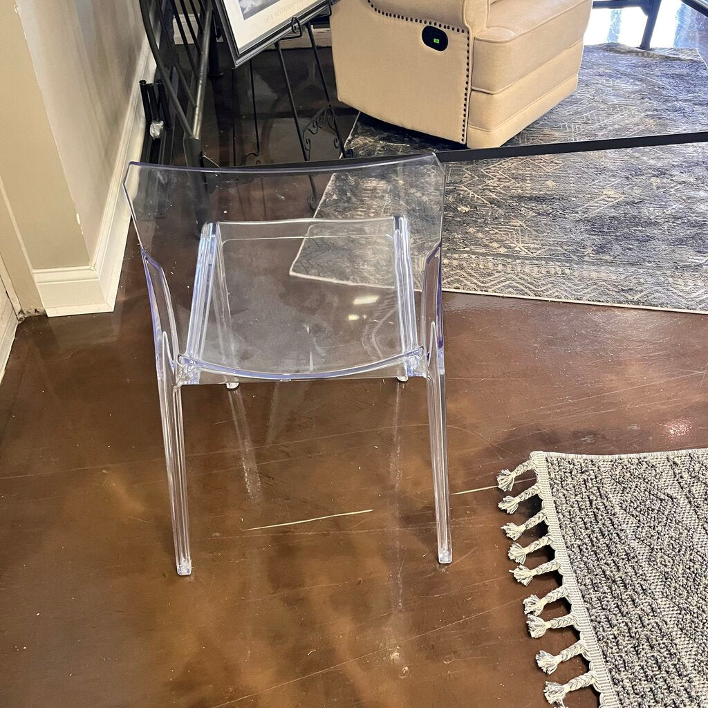 Condition Notes: Previously owned. This Italian made seat bares it all in brely there clear polycarbonate. Thick cut and modern, clearly works with any table. Even better, they stack up to disappear in an instant. Overall good condition.