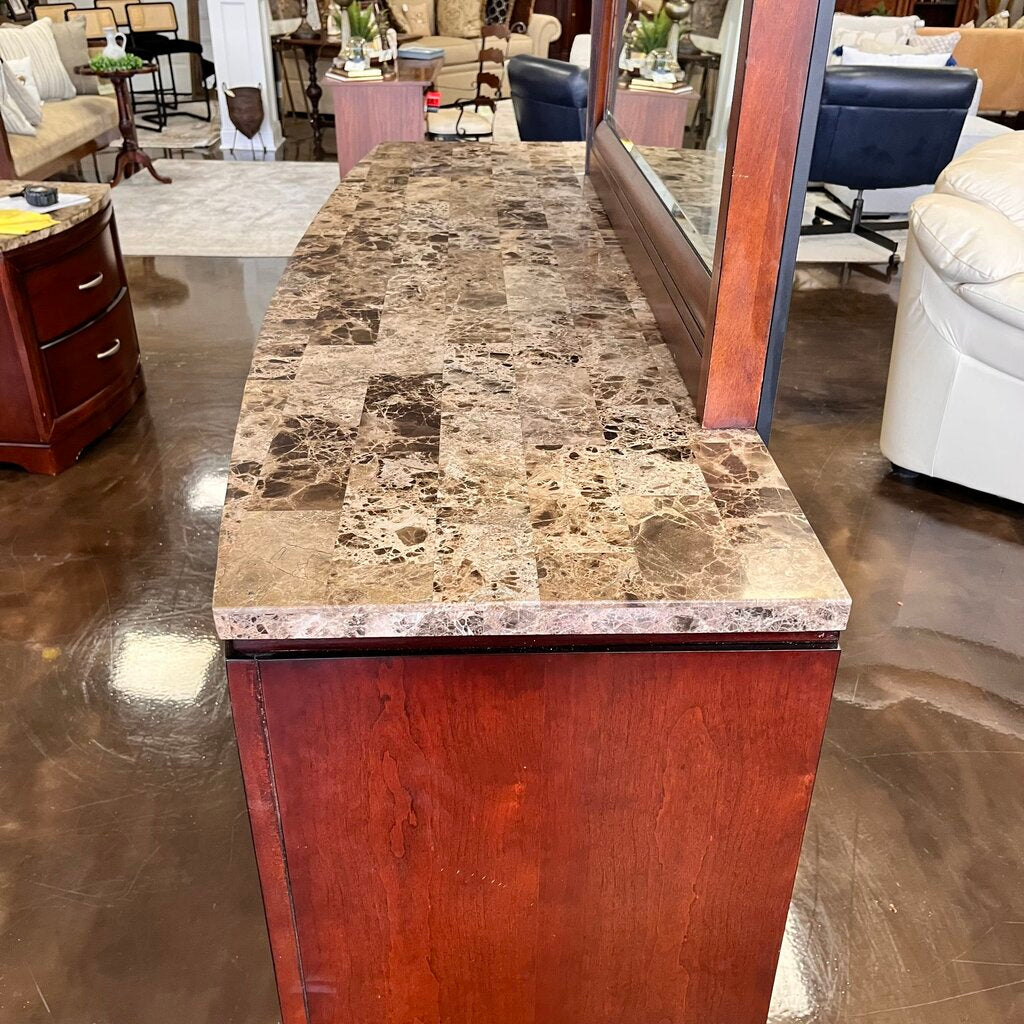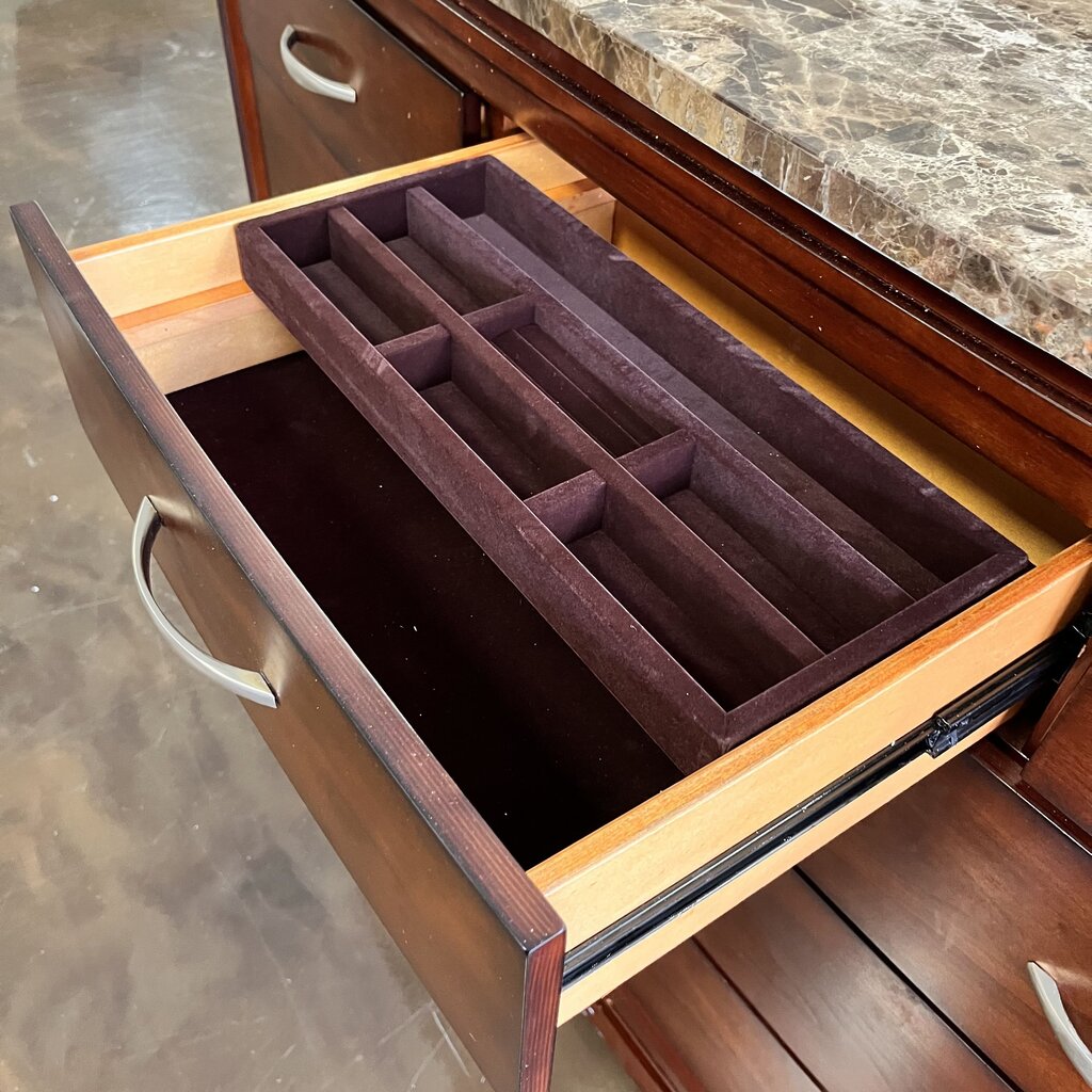 Condition Notes: Previously owned. Contemporary elements with clean lines and soft shapes give this piece an edgy yet comfortable feel. This piece features 9 drawers for ample storage. Two are velvet lined with one having a tray for jewelry or other small items. Overall good condition.