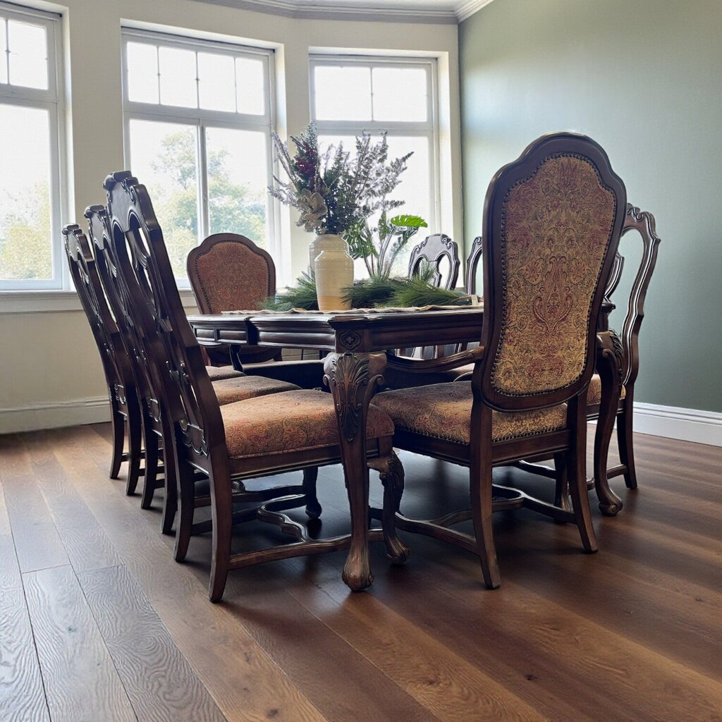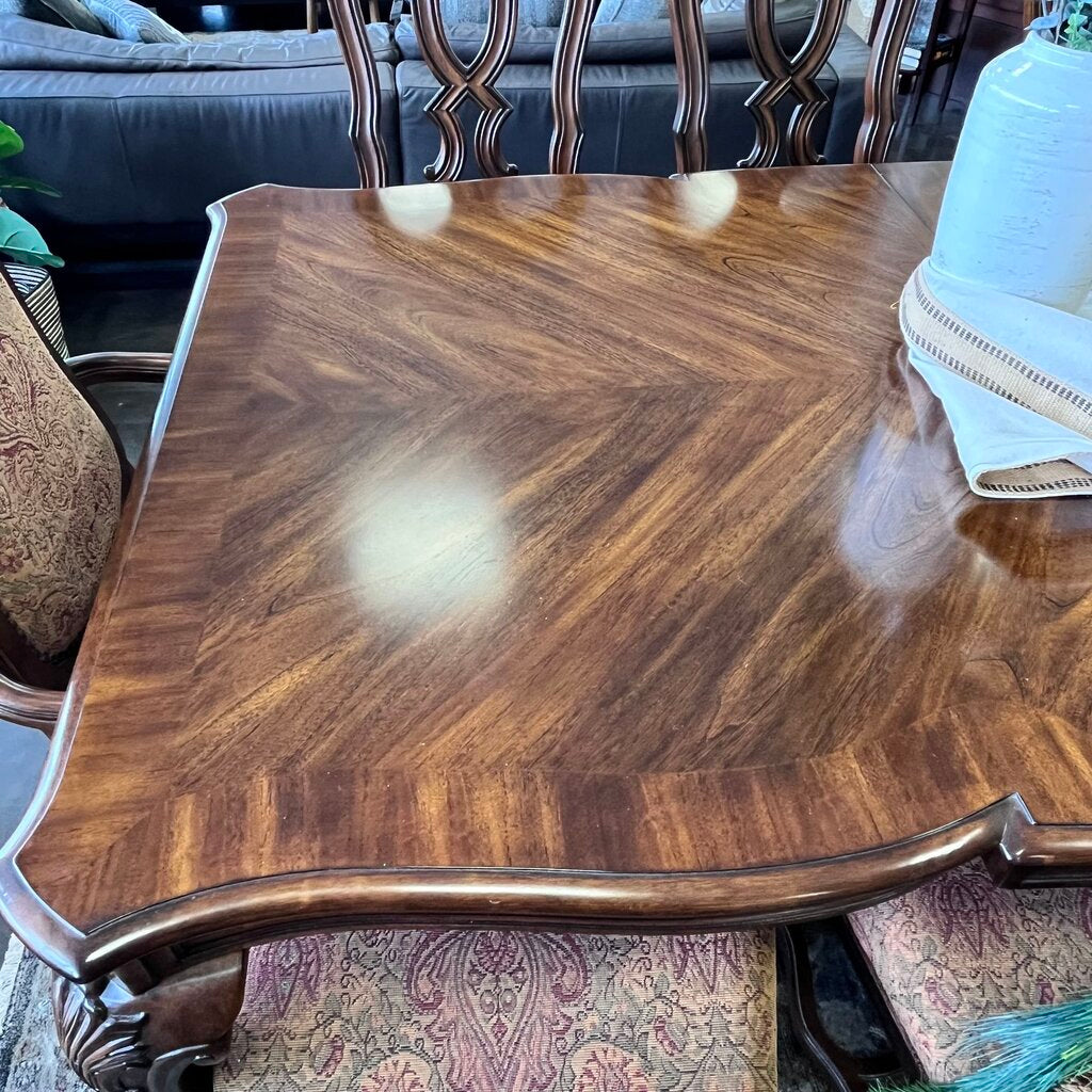 Condition Notes: Previously owned. This stunning, elegant dining table offers a timeless appeal. The rich dark wood finish and intricately carved details exude sophistication and add warmth to any dining space. The table includes 2 leaves and 8 chairs upholstered in a tapestry print fabric. Overall great condition.