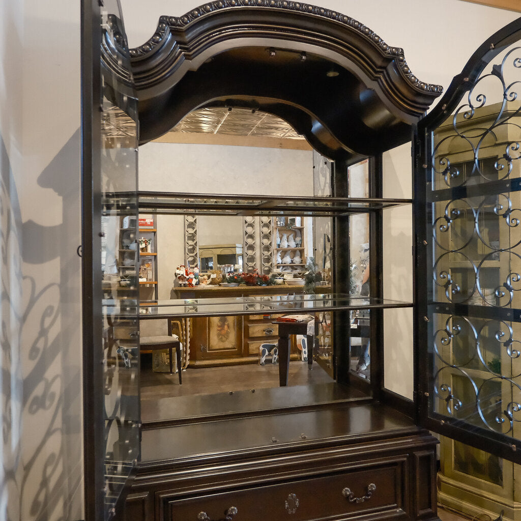 Condition Notes - Good Condition, gorgeous aesthetic features such as metal scroll on the glass doors, egg and dart variation on the bonnet top trim, adjustable glass shelves, the valencia display cabinet organizes all of your decorative and dining items while maintaining an elegant tradtional look