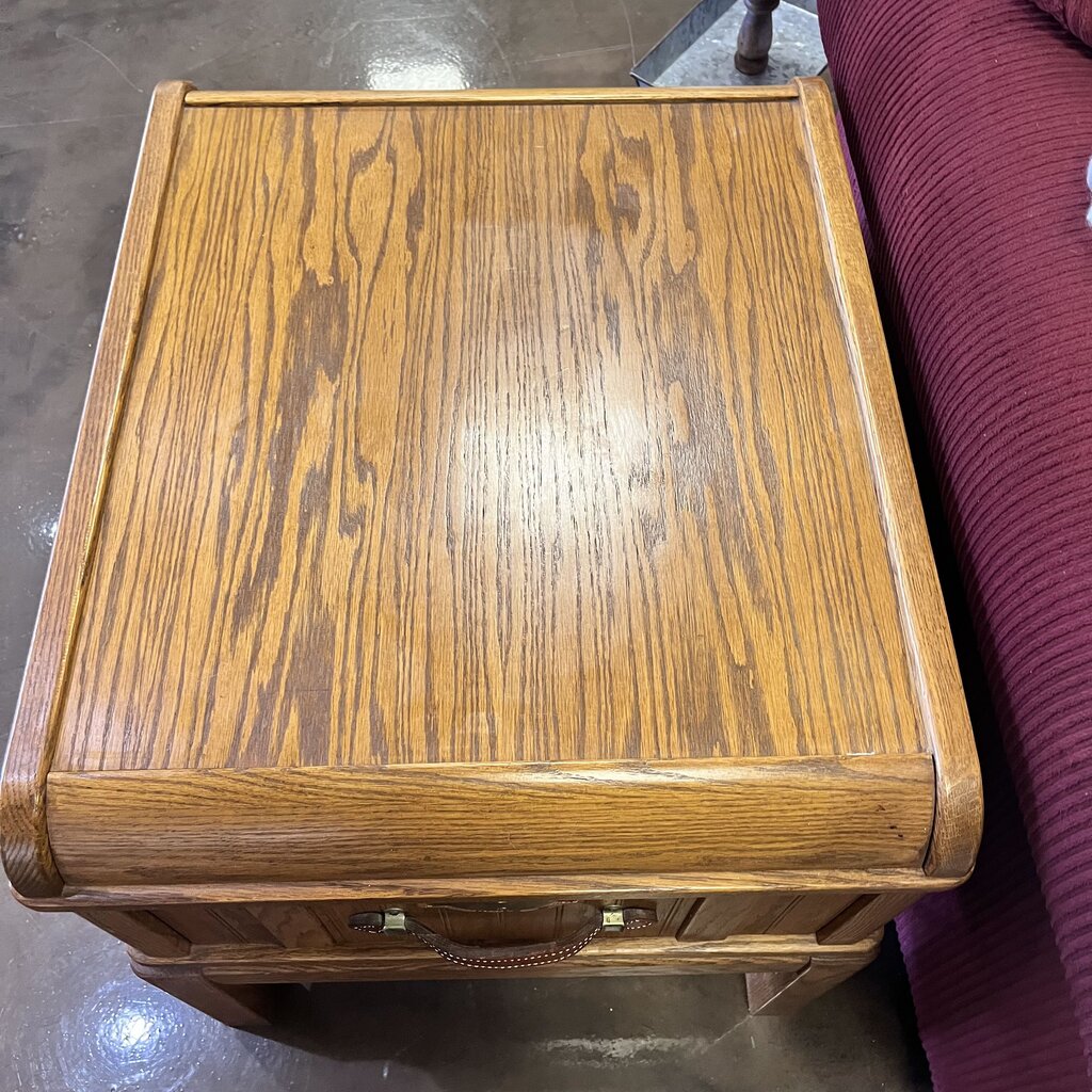 Condition Notes: Previously owned. This charming end table offers rustic elegance and practical sstorage perfect for enhancing any living space. It has a distinctive trunk style and vertical wood plank detailing with a leather drawers pull. Sized perfectly as an end table next to a sofa or chair. Overall great condition.