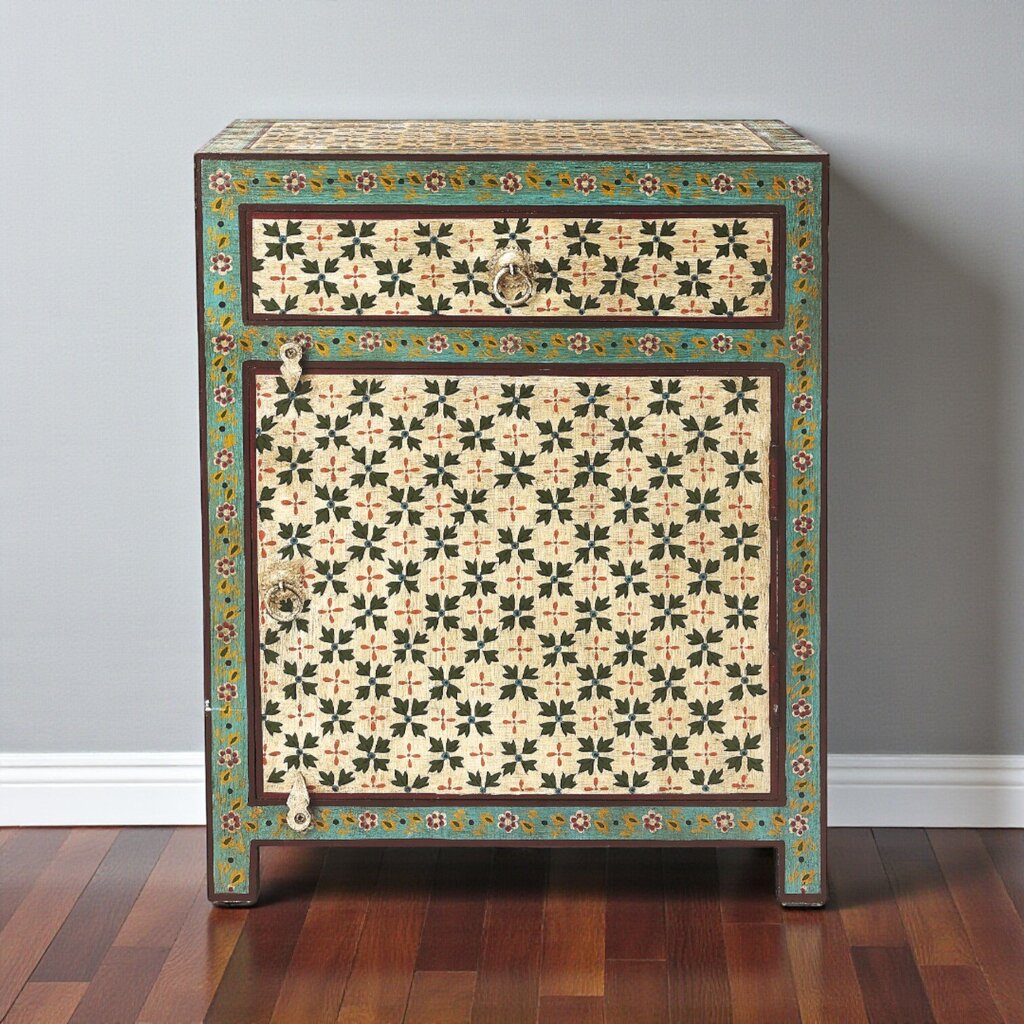 Brand New Item from Commercial Consignor, floor model / back stock / will exibit minor imperfections, super price on new furniture, Add this Butler Specialty Company accent cabinet as a great option for getting much-needed storage in a room without compromising on style. Crafted from solid Meranti Wood and MDF, this piece features a single drawer and cabinet with coordinating hardware, in a hand painted primitive pattern for a Bohemian chic look. Use as chairside for your favorite lamp, or in the bedroom as night stand.