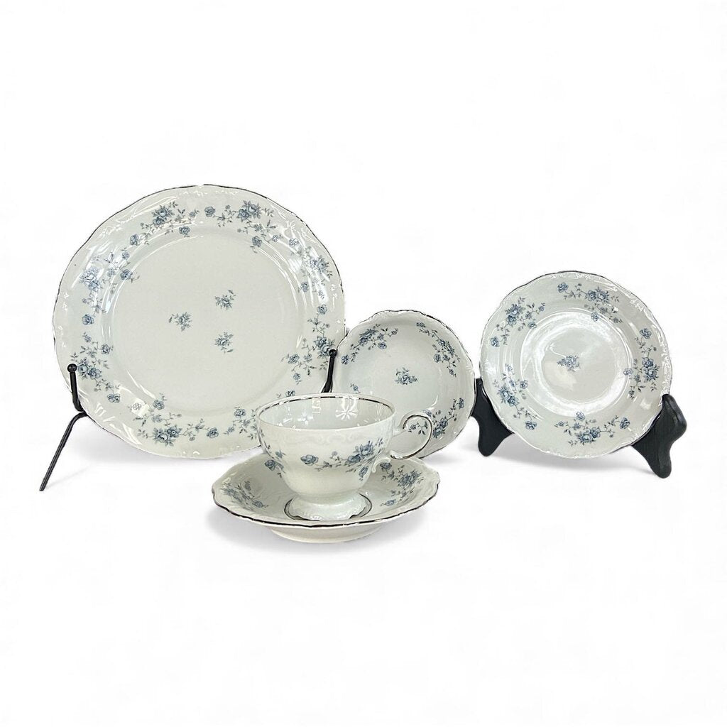 Condition Notes: This beautiful and timeless china set is perfect for hosting a dinner party for 10-11 guests. It features an elegant pale blue floral pattern accented with platinum trim. The set includes the following pieces: one oval serving platter, one vegetable bowl, one gravy boat, two creamers, two sugar bowls, twelve saucers, eleven cups, twelve bread and butter plates, twelve dinner plates, twelve dessert bowls, a salt shaker, and a pepper shaker. Excellent previously owned condition.
