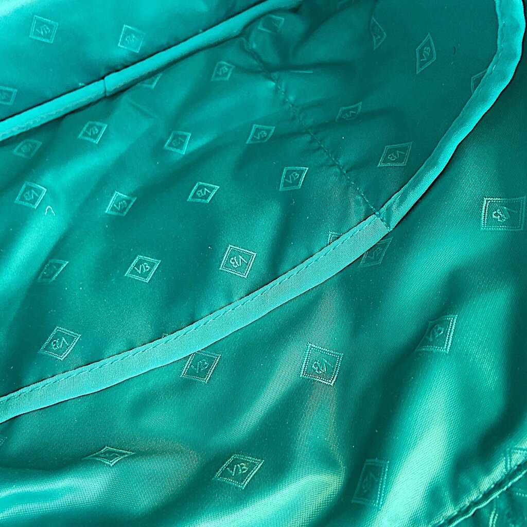 Condition Notes: This tote bag, designed by Vera Bradley, has a quilted bright teal fabric exterior with pleather trim. The interior can be accessed with a zipper, which is lined with a monogrammed bright teal nylon fabric. The exterior has a small zipper compartment on the back of the tote and a small open compartment on the front of the tote. Inside the tote are three open compartments on each side. Excellent previously owned condition.