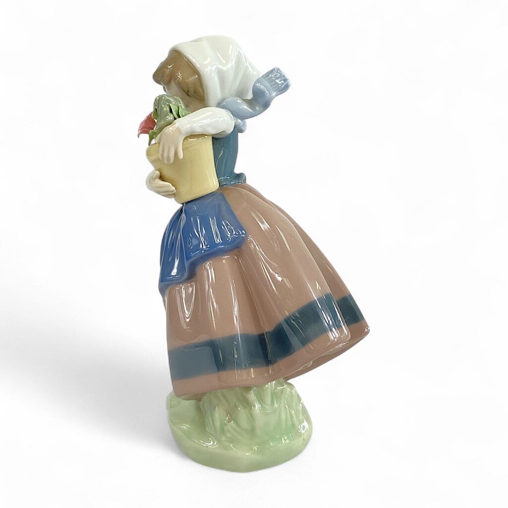 This collectible figurine depicts a girl holding a basket filled with flowers. Lladro figurines are highly sought after and are typically made of porcelain, often showcasing people engaged in various activities, such as flower picking, and presented in different contexts. Good previously owned condition.