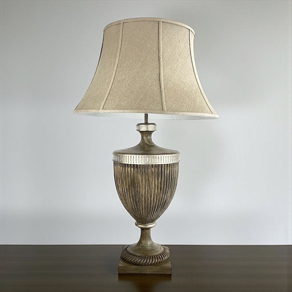 Condition Notes: This table lamp features a dark gray, urn-shaped body accented with pewter-colored bands. The lamp shade is a round, bell shape made of light gray fabric. Excellent previously owned condition.