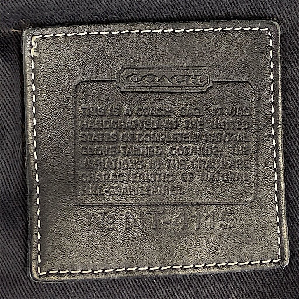 Condition Notes: This handbag is a Coach model featuring a monogrammed fabric exterior and a black leather base. The purse also has a metal tag accent with the Coach logo. The interior opens with a thin leather strap with a clip. Inside, the bag is lined with black fabric and has a zipper compartment on the side of the interior. The side of the bag has a small amount of fraying. Otherwise, the bag is in good, previously owned condition.